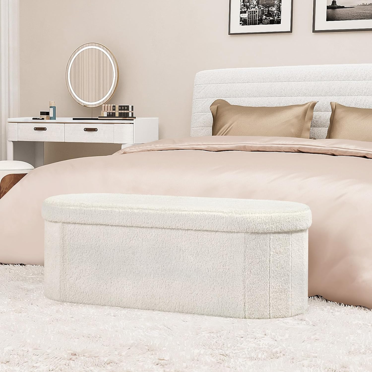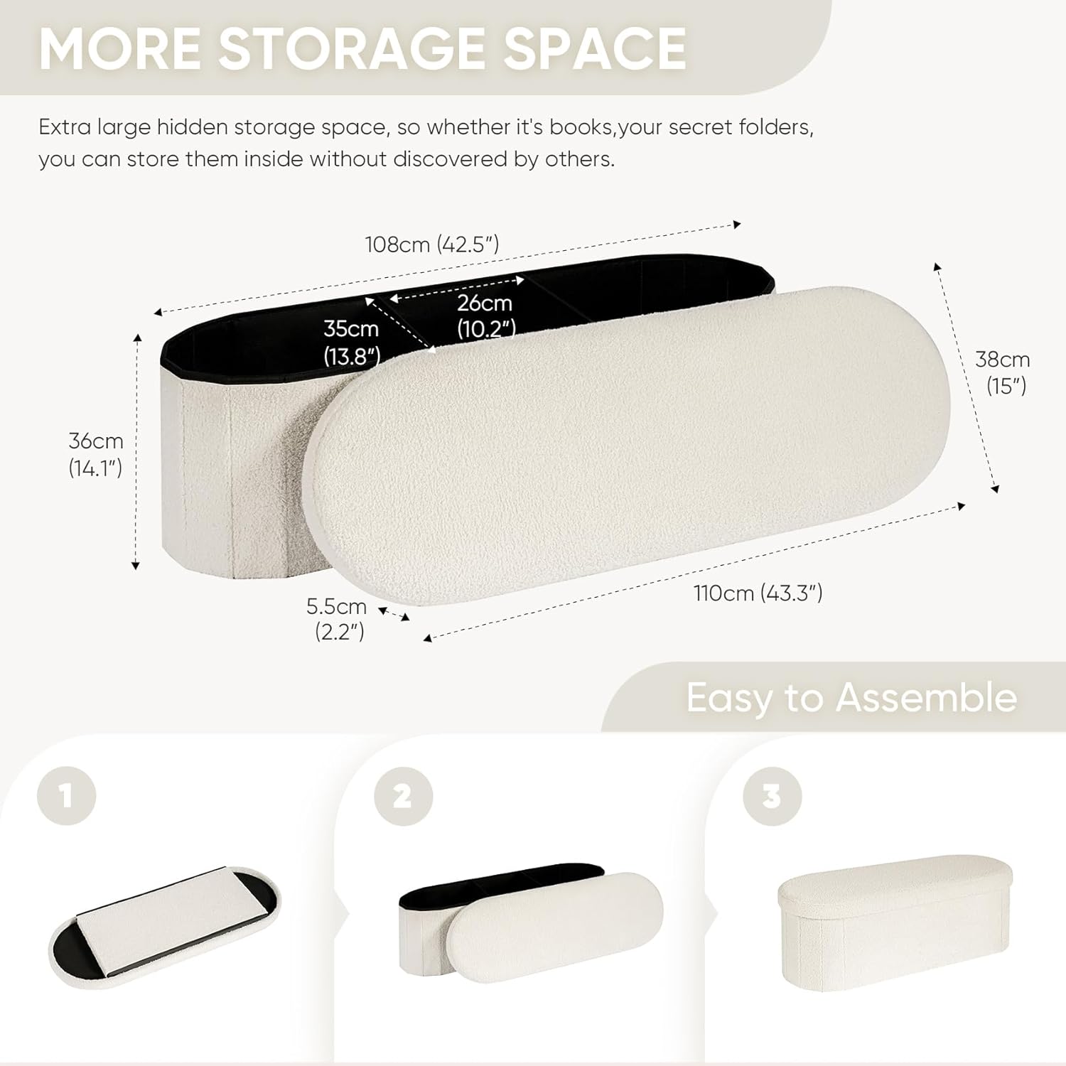 Bonlife Folding Ottoman Storage Bench,Boucle Footstool Oval, End of Bed Stool, Ideal for Living Room, Bedroom, 100L Storage Space,White