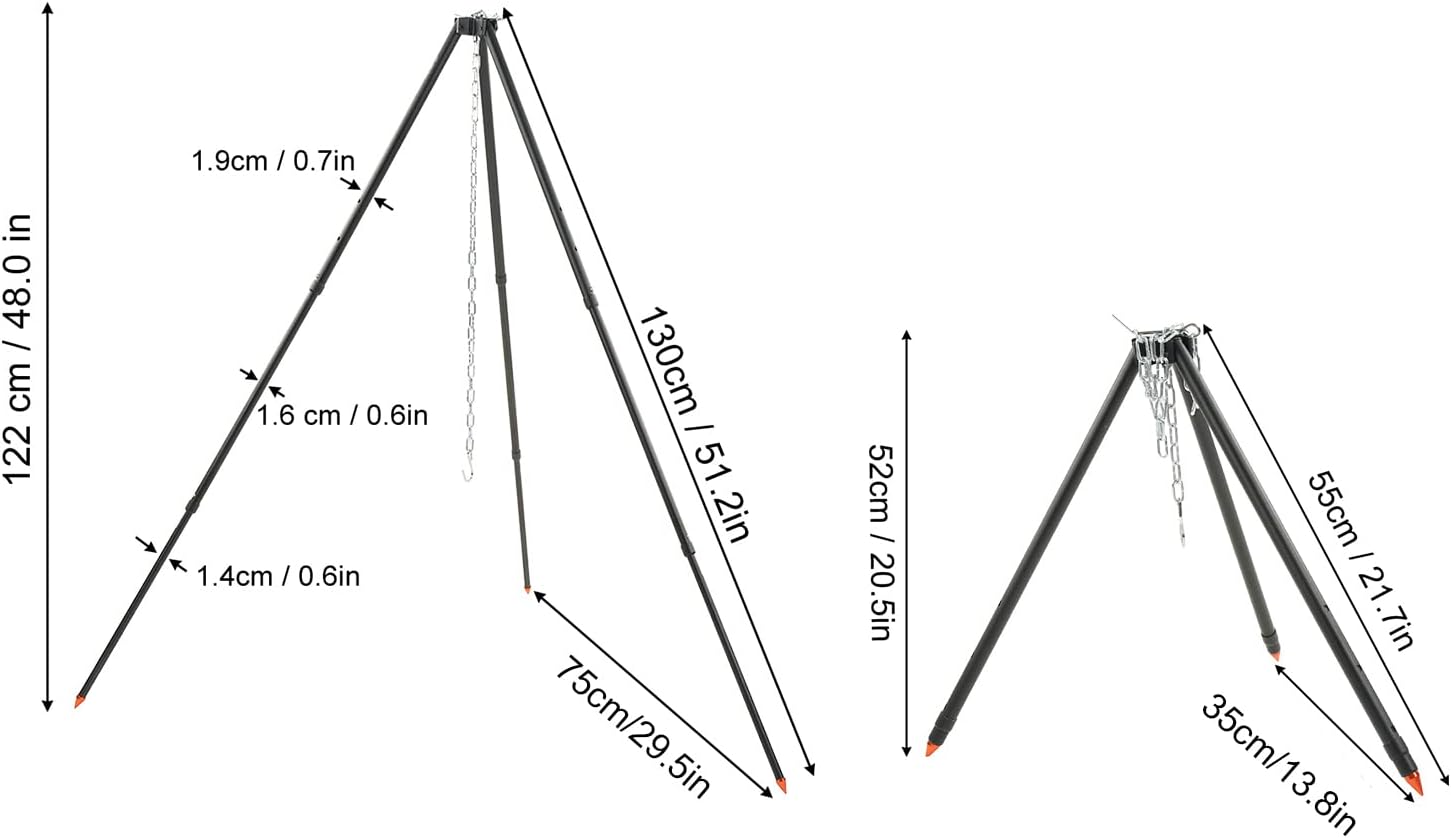 Easy Installation: Experience hassle-free setup with this user-friendly camping tripod. No tools or assembly are required. Simply unfold the legs and secure the chain at the top. With a tube diameter ranging from 1.9cm to 1.4cm, the tripod offers both strength and portability.