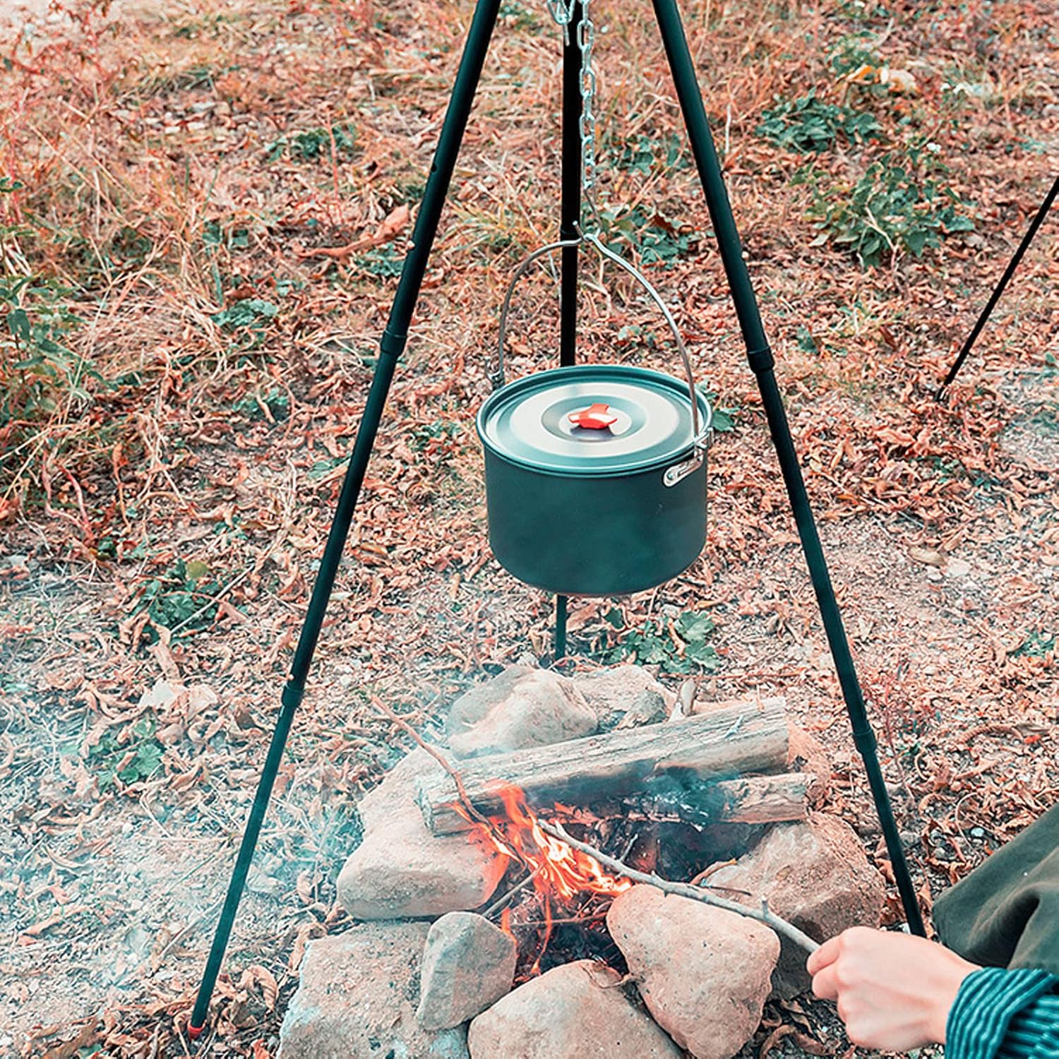 Protective Foot Cover: Equipped with a pointed base and non-slip protective foot covers, this tripod ensures stability on any terrain without causing damage. The 110cm distance between the legs guarantees balance and prevents tipping, allowing for worry-free cooking on uneven surfaces.
