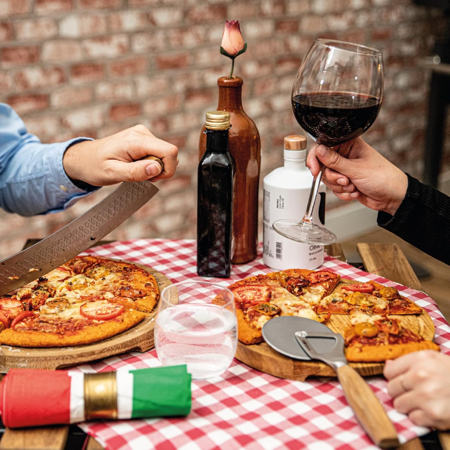CONTENTS: stainless steel and oak wood pizza cutter