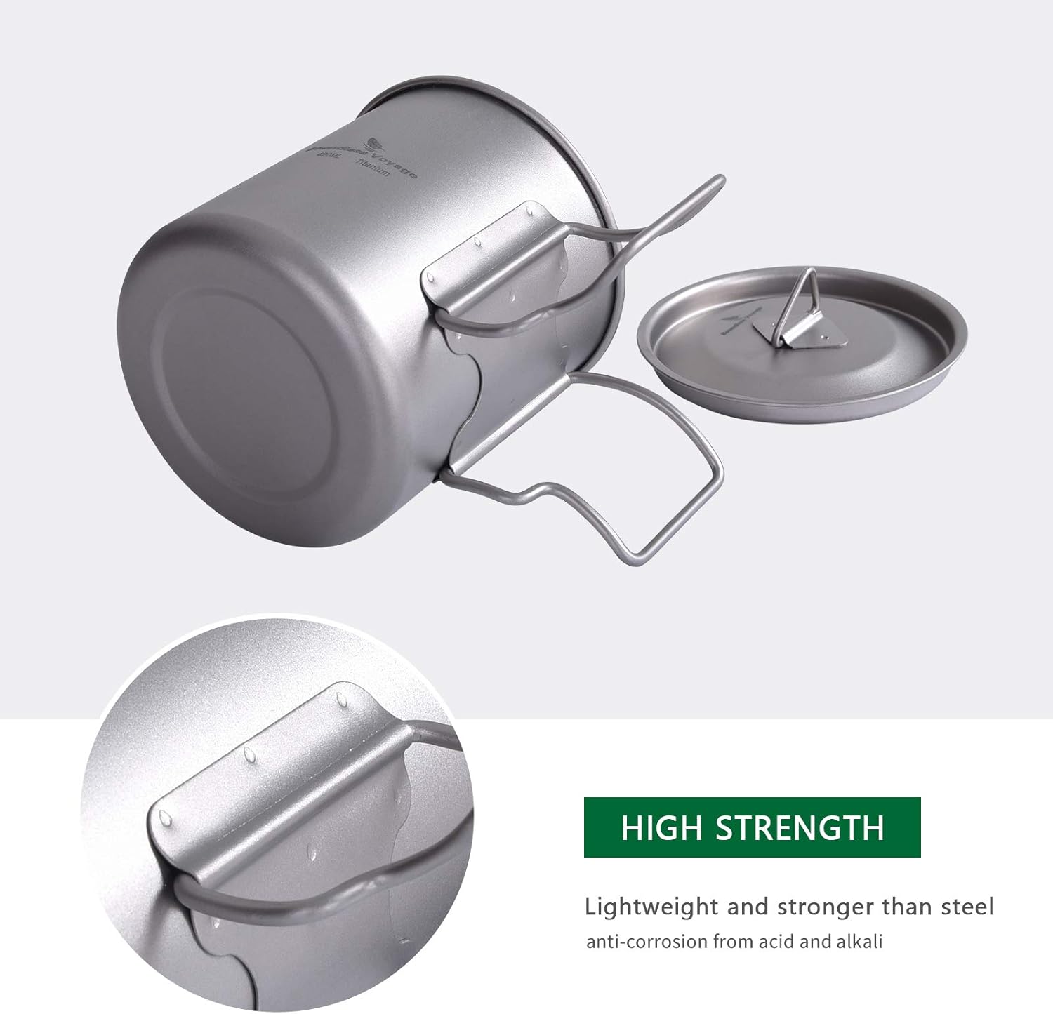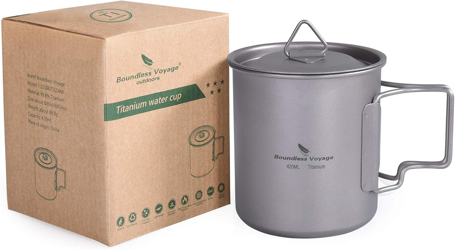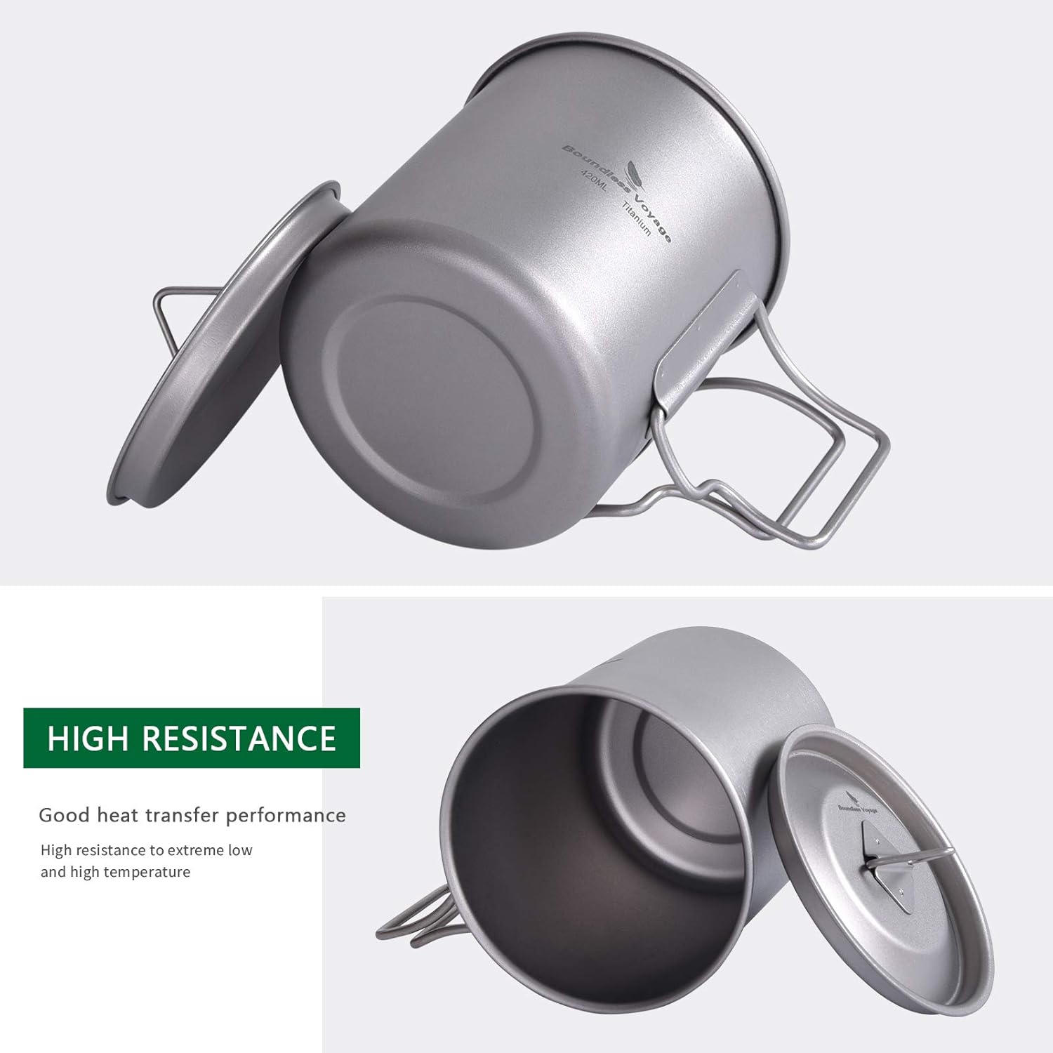 Boundless Voyage Camping Cookware 420ml Titanium Camping Pot with Lid Foldable Handle Ultralight Titanium Cup Coffee Mug for Backpacking Hiking Ti1544B