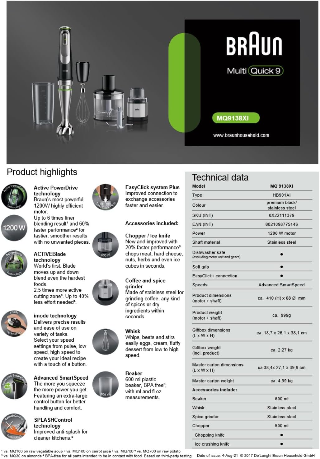 Braun MQ 9138XI MultiQuick 9 Hand Blender Braun’s flagship Multi Quick 9 just got better. Introducing new, cutting-edge features like Active PowerDrive Technology that produces supreme performance thanks to its 1200-watt highly efficient motor. Effortlessly tackle the most challenging jobs with Braun’s most powerful and best performing hand blender. ActiveBlade Technology incorporates a flexible shaft that moves the blade up and down to easily turn the toughest ingredients into the most delicious creations. Whilst the new imode Technology allows for more precise results at the push of a button. 3 speed mode concentrates blending power into practical power zones. Low speed mode limits the speed range for soft ingredients. Whereas in high the full speed range of power is available for the hardest ingredients. Pulse automatically delivers evenly cut ingredients without smashing. The Advanced SmartSpeed features an extra large control button for better handling and comfort, the more you squeeze the more power you get. The MQ9138XI attachments all feature an EasyClick system which has an improved connection to exchange accessories faster and easier. Includes; 500ml Chopper Attachment, Coffee/Spice grinder, 600ml Beaker, Stainless Steel Whisk and Ice Blade, allowing you to get creative in the kitchen. Features: Active PowerDrive Technology 1200W Motor ActiveBlade Technology SplashControl Technology Advanced SmartSpeed Easy Click System – For seamless exchanging of accessories Dishwasher safe parts Cord length 1.2m Child safety lock What’s in the box? MQ9138XI Hand Blender 600ml Beaker 500ml Chopper Ice Blade Coffee and spice grinder Stainless Steel Whisk