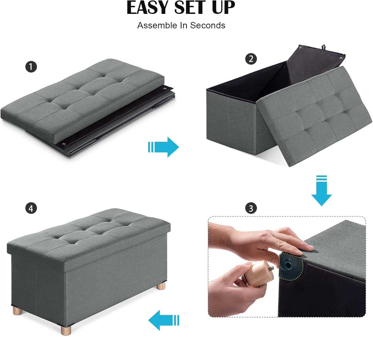 BRIAN & DANY Ottoman Storage Box with 4 Wood Legs, Linen Storage Ottoman for Living Room, Gray, 76 x 38 x 38 cm