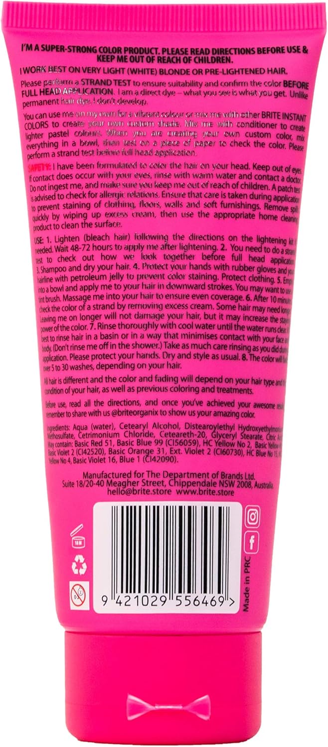 ABOUT THE PRODUCT – BRITE Pink Instant Colour is a Semi-Permanent, ultra-hydrating hair colour that transforms your hair into a gorgeous pink hue. The moisturizing formula conditions as it colours, leaving your hair silky smooth. Our Instant Colour system locks in vibrancy so you get bolder, more beautiful results that last up to 30 washes. Suitable for all hair types and textures. Colour results will vary based on starting hair shade. WHY YOU NEED IT – BRITE Instant Colour is a semi-permanent direct dye, so it does not develop like a permanent hair colour. What you see is what you get, with colour that lasts for 5–30 washes, with a gradual, even fade. You can mix with other BRITE Semi-Permanent Colours to create your own custom shade or mix with conditioner to create lighter pastel colours. Ideal for light (white) blonde or pre-lightened hair. PETA certified, vegan, and cruelty-free. HOW TO USE – Shampoo and dry your hair. No need for conditioner. Pop on some gloves, put petroleum jelly on your hairline and cover your clothes. Use a brush or your hands to apply Instant Colour onto your hair. Massage it into your hair for flawless even coverage. Check colour after 10-15 minutes. You can leave the dye on longer for a more vibrant result without damaging your hair. The longer you leave it on, the longer the colour tends to last after. Rinse clean once desired colour is achieved. CAREFULLY FORMULATED – This vegan, cruelty-free semi-permanent hair dye delivers long-lasting colour while conditioning your hair from root to tip. Our Instant Colour formulas have been consciously crafted to combine fun, vibrant results with gentle, nourishing ingredients. Free of parabens, ammonia, bleach, and developers. ABOUT THE BRAND – BRITE is a sustainable brand focused on ethical and healthy hair care for those that like to be creative, have fun and love our world. Our ammonia-free formulas allow you to achieve and maintain gorgeous head-turning hair colours at home. We care about the environment and take care in our manufacturing processes to minimise our environmental impact. We never on test our products on animals, we are PETA certified, and all of our products are vegan.