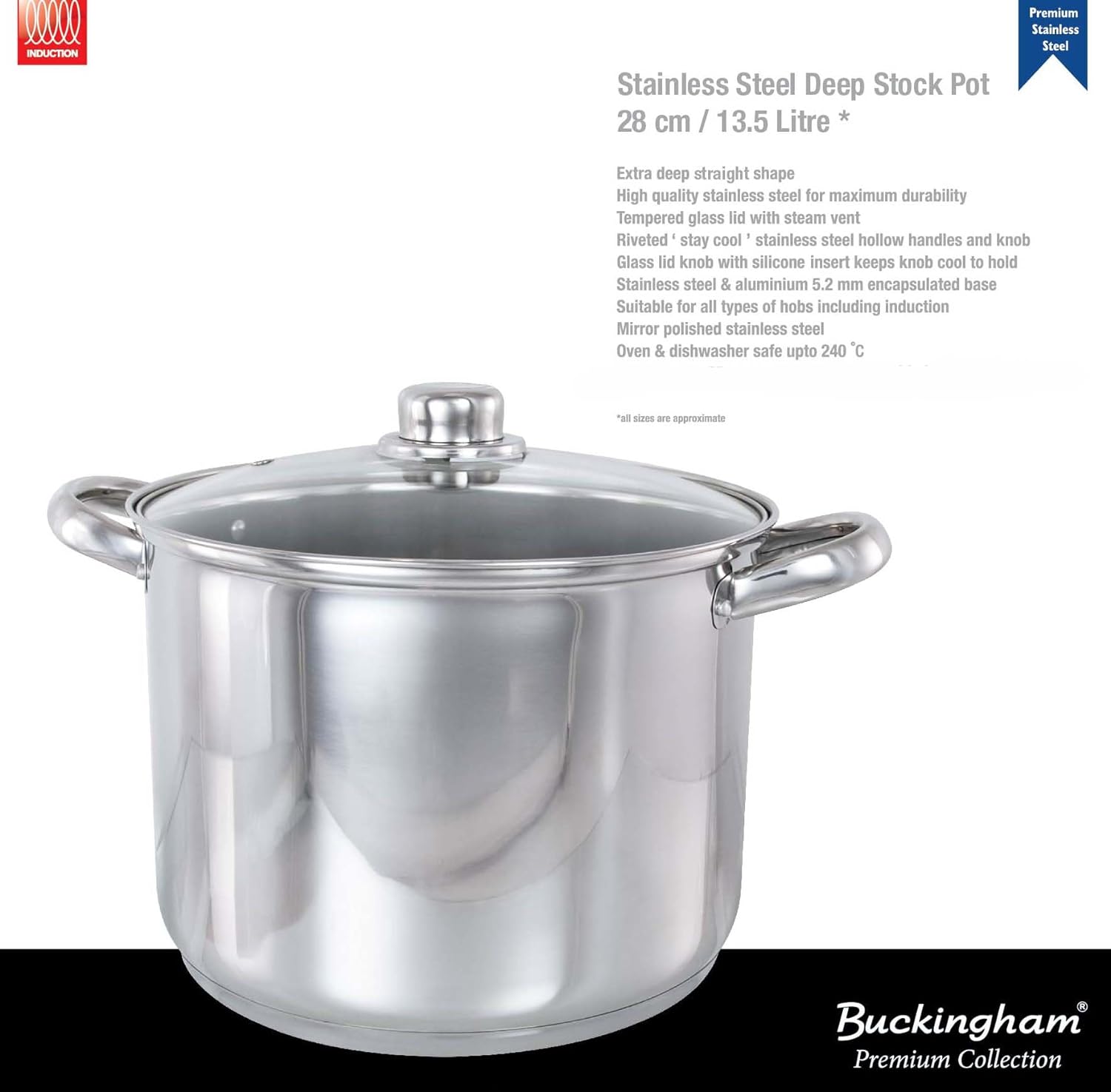 Buckingham stainless steel extra deep stock pot 13.5 Litres … Premium Quality High quality heavy gauge Buckingham stainless steel extra deep stock pot with a tempered glass lid with a steam air vent. Stainless steel and aluminium 5.2 mm encapsulated base for even distribution of heat. Riveted ‘stay cool’ stainless steel handles and lid knob. Glass lid knob with innovative silicon insert keeps knob cool to hold. Suitable on all heat sources including induction hobs. Care Instruction: These casserole pan should not be filled over and above the rivets. . While cooking stir well to avoid food burning.