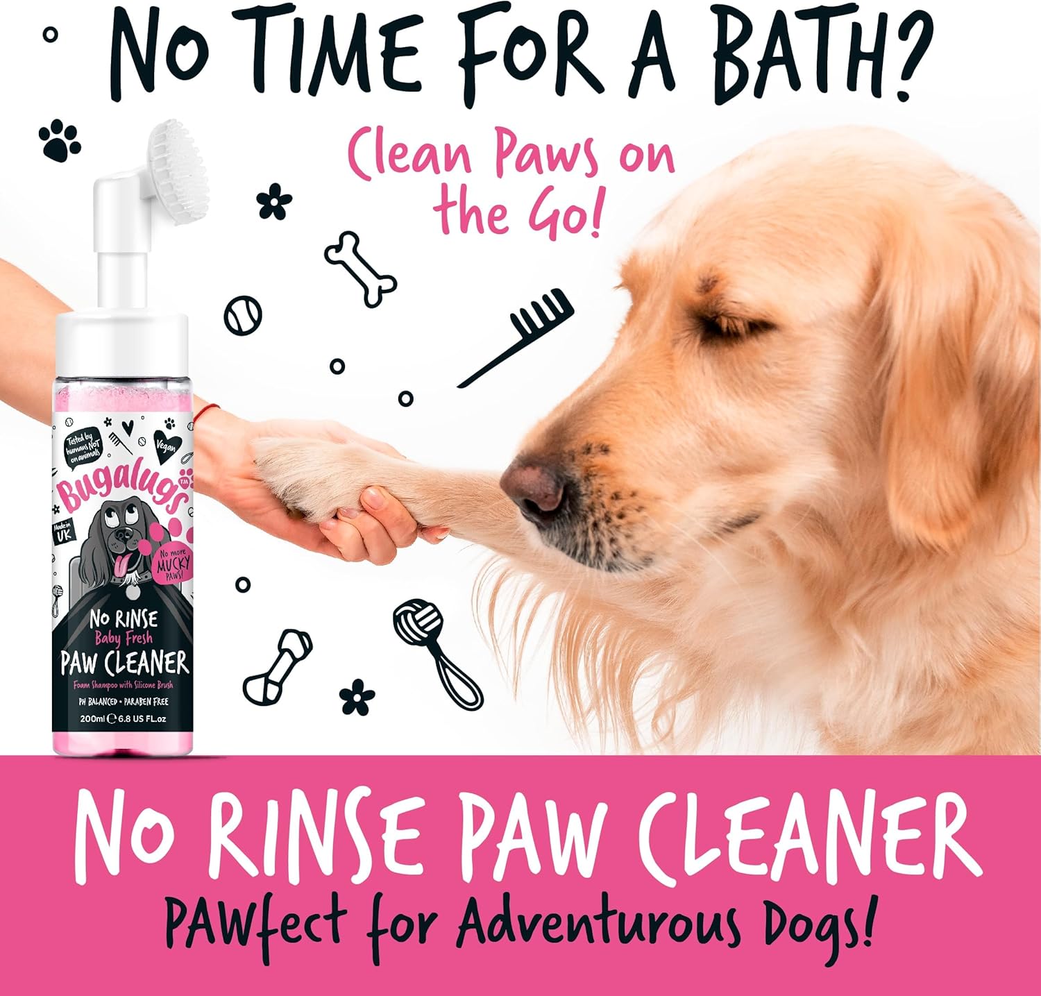 BUGALUGS Dog Paw Cleaner No Rinse Foam Cat & Dog shampoo with Silicone Brush Head, waterless grooming products. Travel friendly paw cleaner for dogs defeat muddy paws on the go (Baby Fresh)