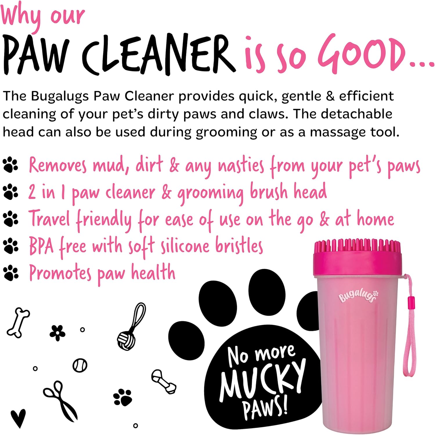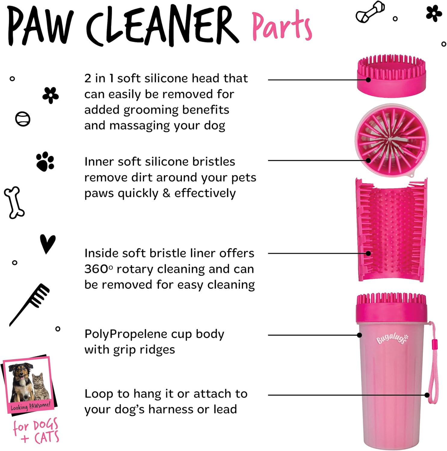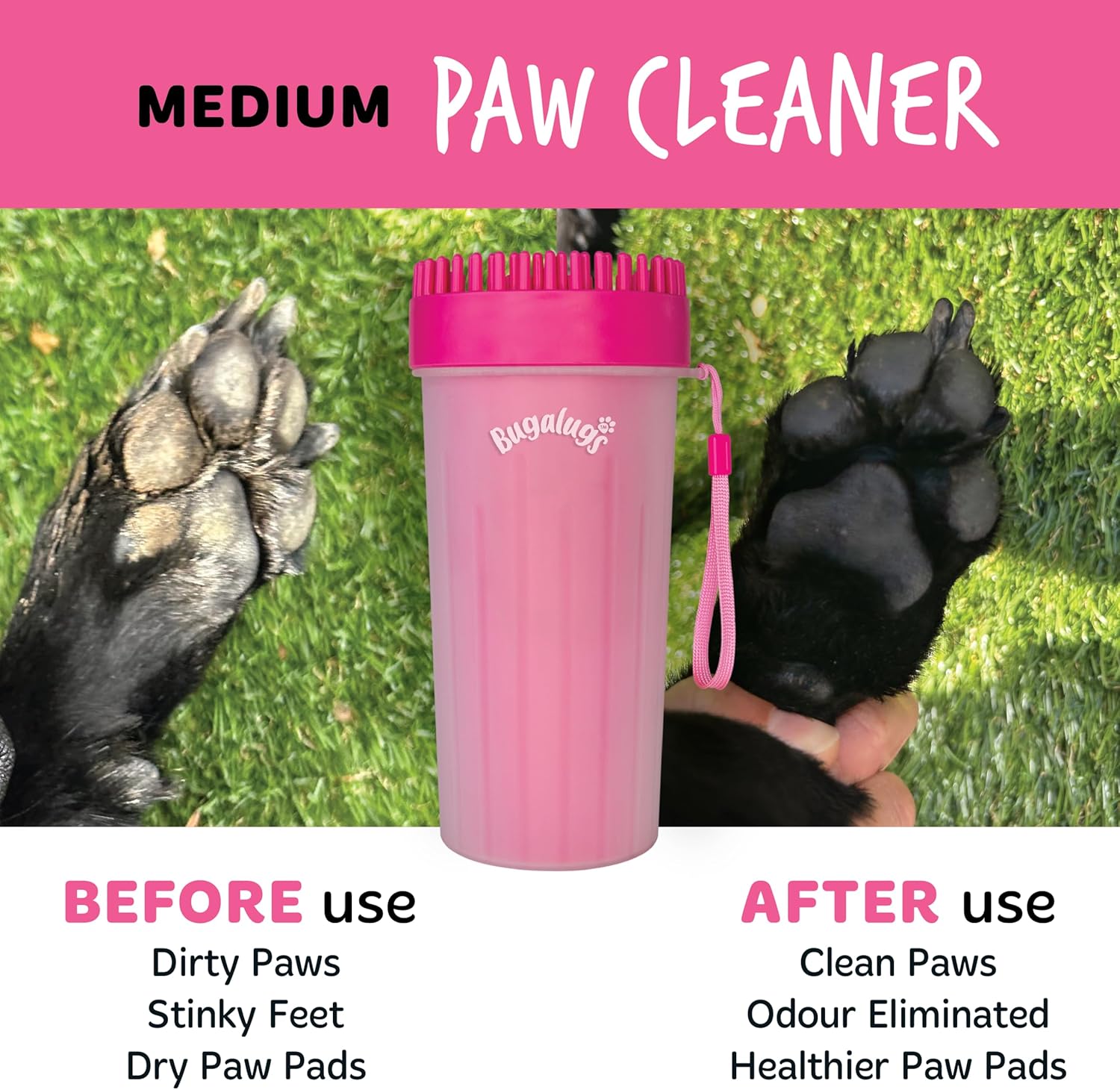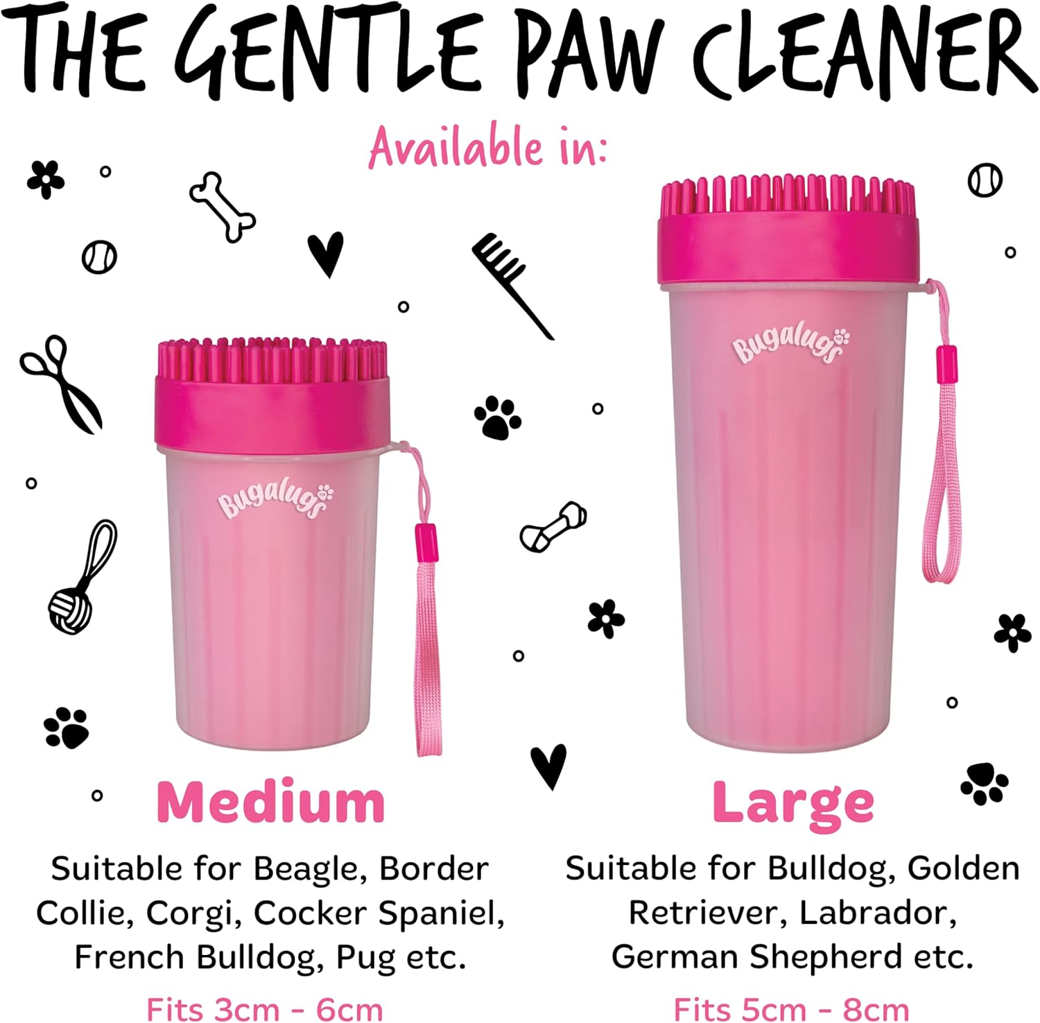 Keep dirty paws in the doghouse! Our soft gentle silicone bristles provide a 360-degree rotary clean to quickly defeat muddy paws in a few speedy steps, making it ideal for washing your pet’s paws on the go. Quickly defeat muddy paws in seconds with our dog paw cleaner! For muddy paws and dirty claws, the Bugalugs Paw Cleaner provides swift, efficient, and yet gentle cleaning of your pet’s dirty paws before they track dirt and mud all over your house and car. Made with a PP cup body with grip ridges and a TPR soft silicone head that can easily be removed for added grooming benefits. The round-headed brush is highly durable with flexible, silicone bristles that are soft yet functional at removing dirt quickly and effectively. Bugalugs Paw Cleaner for Dogs is also BPA free and suitable for both cats and dogs. Travel friendly for ease of use on the go and at home, Bugalugs Paw Cleaner is a portable dog washer that’s great at removing mud and dirt, but also in helping to remove irritants and allergens from your pet’s paws. With a 2 in 1 paw cleaner and grooming brush head, this must-have multipurpose device removes dirt and grime from pet’s paws quickly and effectively while promoting paw health – perfect dog walking accessories! The Bugalugs Paw Cleaner is simple and easy to use. Add some water to the paw cleaner (you can add a drop of Bugalugs shampoo too), guide your dog’s muddy paw into the soft, gentle silicone bristles and twist the cup back and forth as many times as needed to, so that the silicone bristles can loosen dirt and mud and thoroughly clean the paw. Remove your dog’s paw from cup, dab dry with a towel and repeat on all paws. After use, simply discard the water and rinse clean. For a deeper clean, place the Bugalugs Paw Cleaner in the dishwasher. Follow up with Bugalugs Paw Balm if necessary. Available in 2 sizes so you can choose the one that’s perfect for you:Size Large – suitable for Bulldog, Golden Retriever, Labrador, German Shepherd etc. Size Medium – suitable for Beagle, Border Collie, Corgi, Cocker Spaniel, French Bulldog, Pug etc.