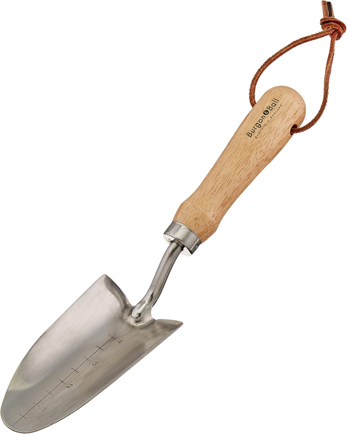 Burgon & Ball RHS Endorsed Transplanter is endorsed by the Royal Horticultural Society, perhaps the ultimate accolade in the gardening world. More slender than our classic stainless steel garden trowel, this transplanter is ideal for working among densely-planted borders. The face is engraved with depth markings in inches so you know exactly how deep you’re planting – especially useful for planting bulbs. The polished stainless steel finish is highly resistant to rust, so it’ll stay beautiful for years to come. The tang (or neck) is precision forged to the perfect angle for ergonomic working, and uses a different composition of steel for optimal strength in this important area of the tool. A sturdy leather hanging cord allows for tidy storage.