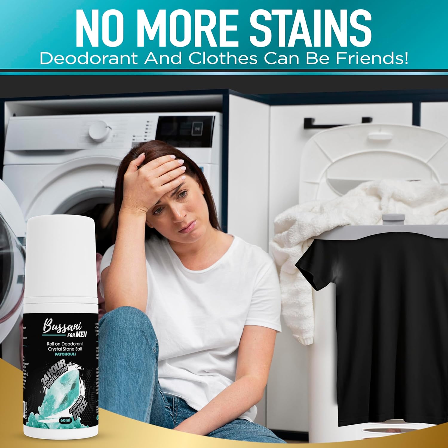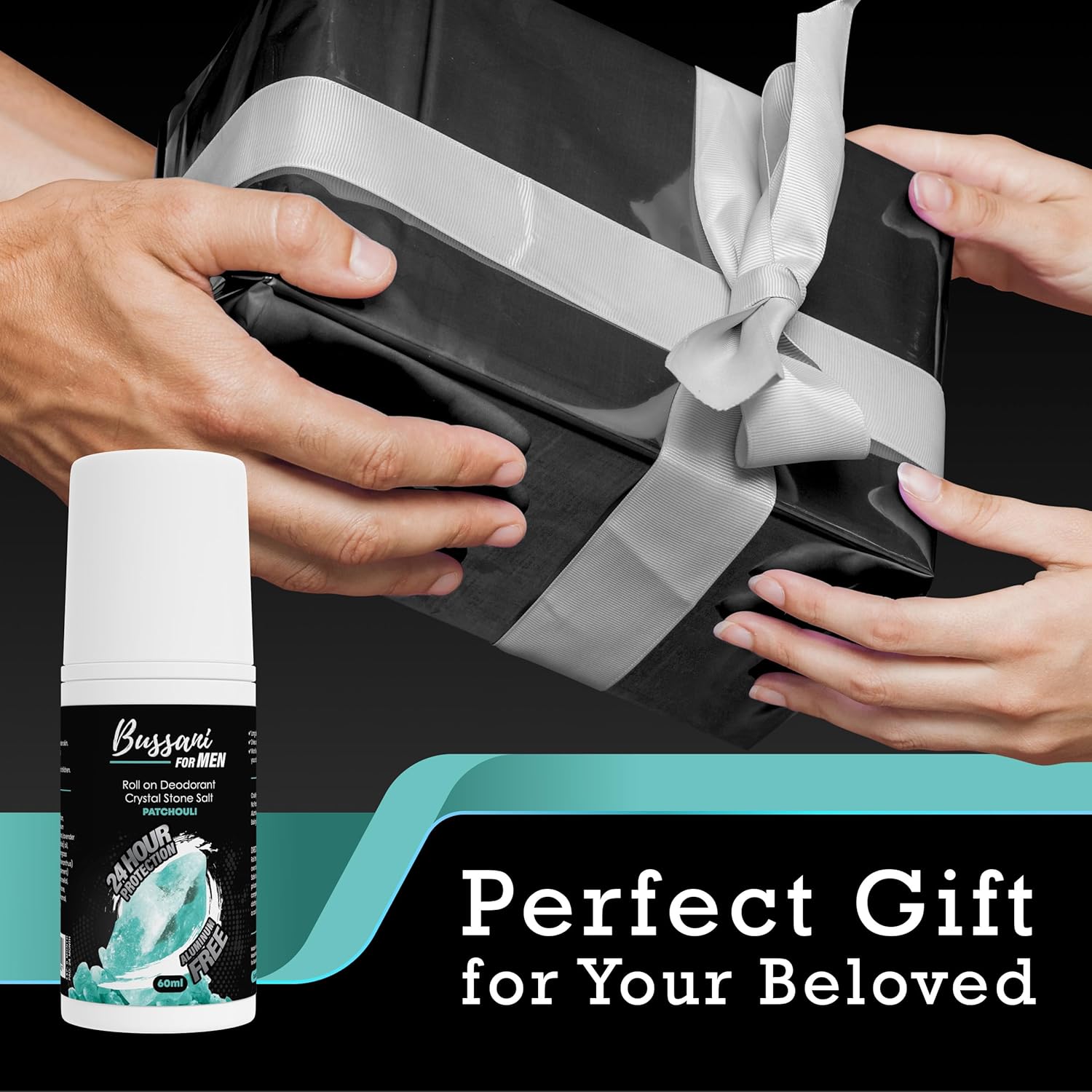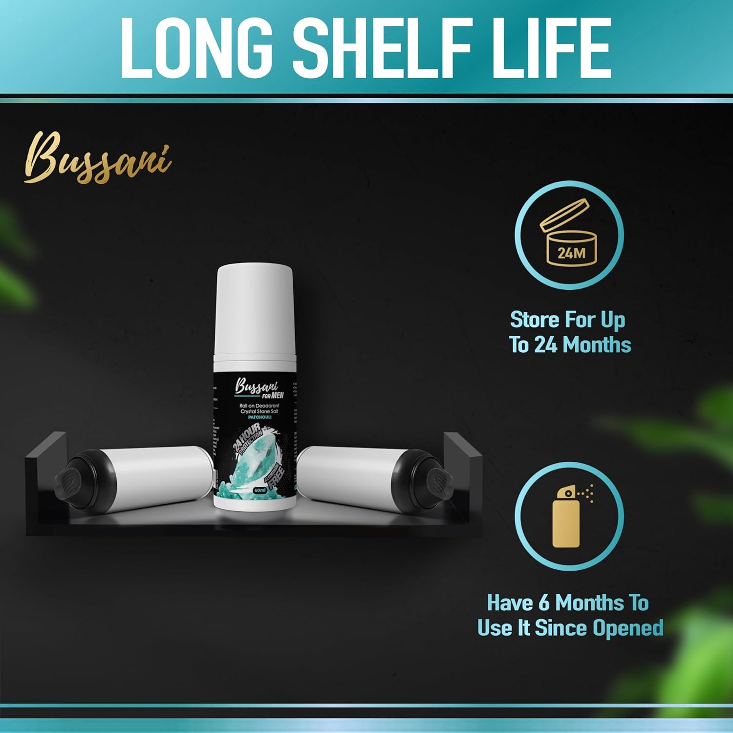 Bussani Men’s Roll-On Deodorant | Crystal Salt Stone, Long-Lasting & Aluminum-Free | 24-Hour Odor Protection | Fragrance: Patchouli Scent, 2.02 fl oz, 3 Pack