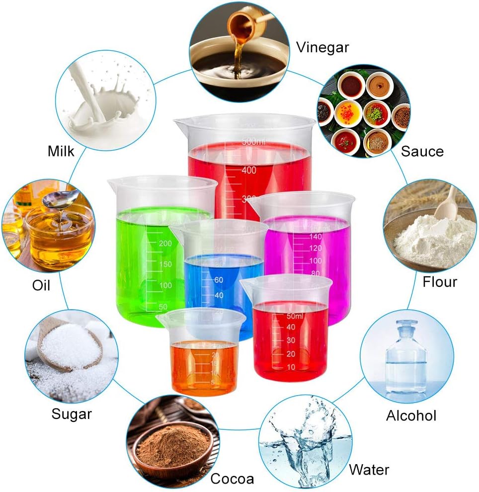 BUZIFU 6 Pack Measuring Cup Labs Graduated Beakers Plastic Beakers Heat Resistant Measuring Jugs Mixing Cups Liquid Measuring Cups Baking Cooking Lab Measure Tool, 25ml 50ml 100 ml 150ml 300ml 500ml