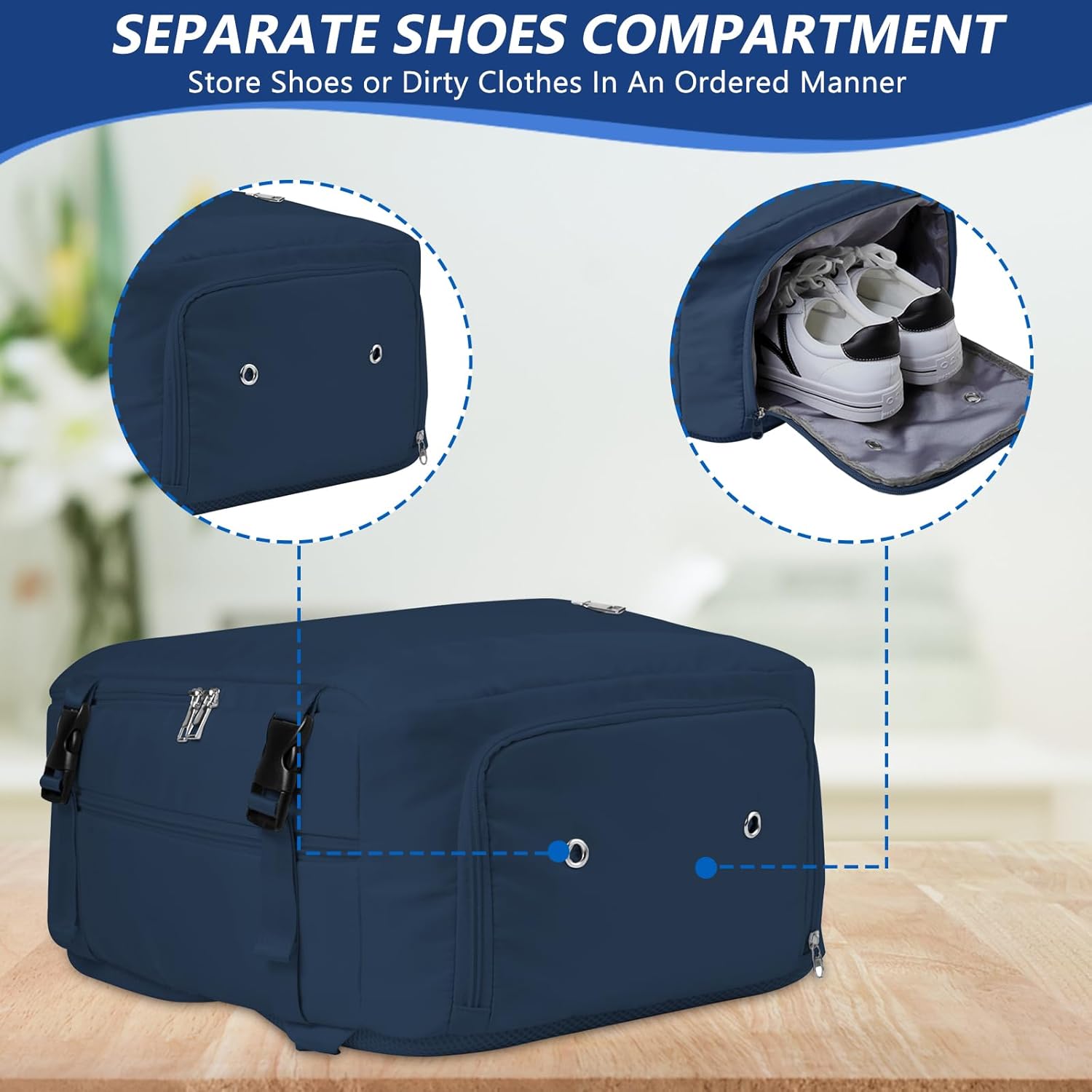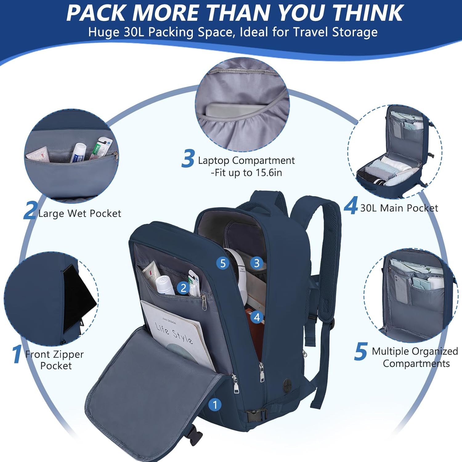 【Multi-Functional Compartment】Separate Wet Pocket for umbrella, towel; A laptop bag with elastic band for laptop (up to 15.6 inch); A bottom bag for shoe compartment; A inner mesh bag with zipper for phone, ID cards; two open inner pocket for ipad,magazine; Front bag for ticket, keys; Spacious main compartment for clothes, other travel essentials; An anti-theft pocket for phone, etc.