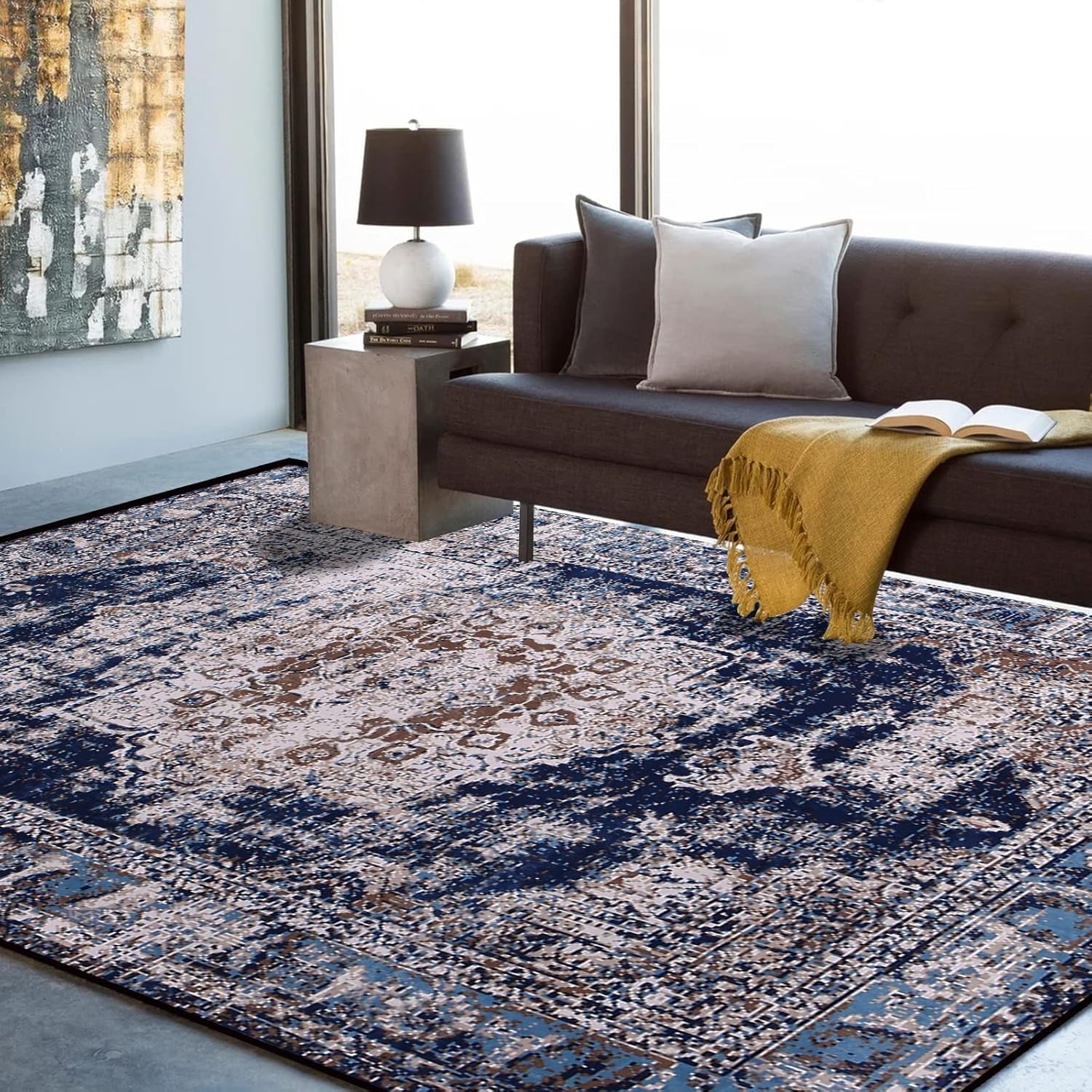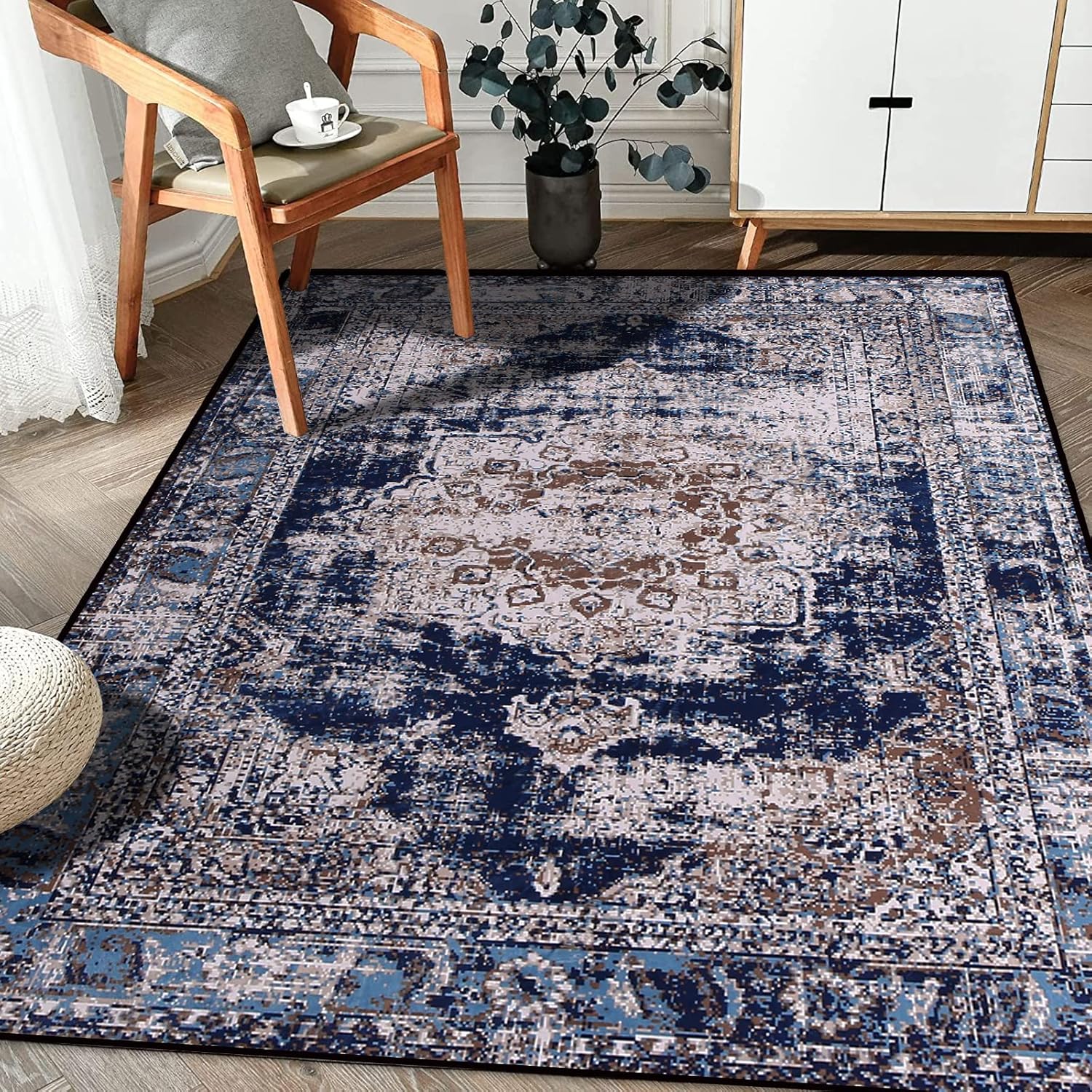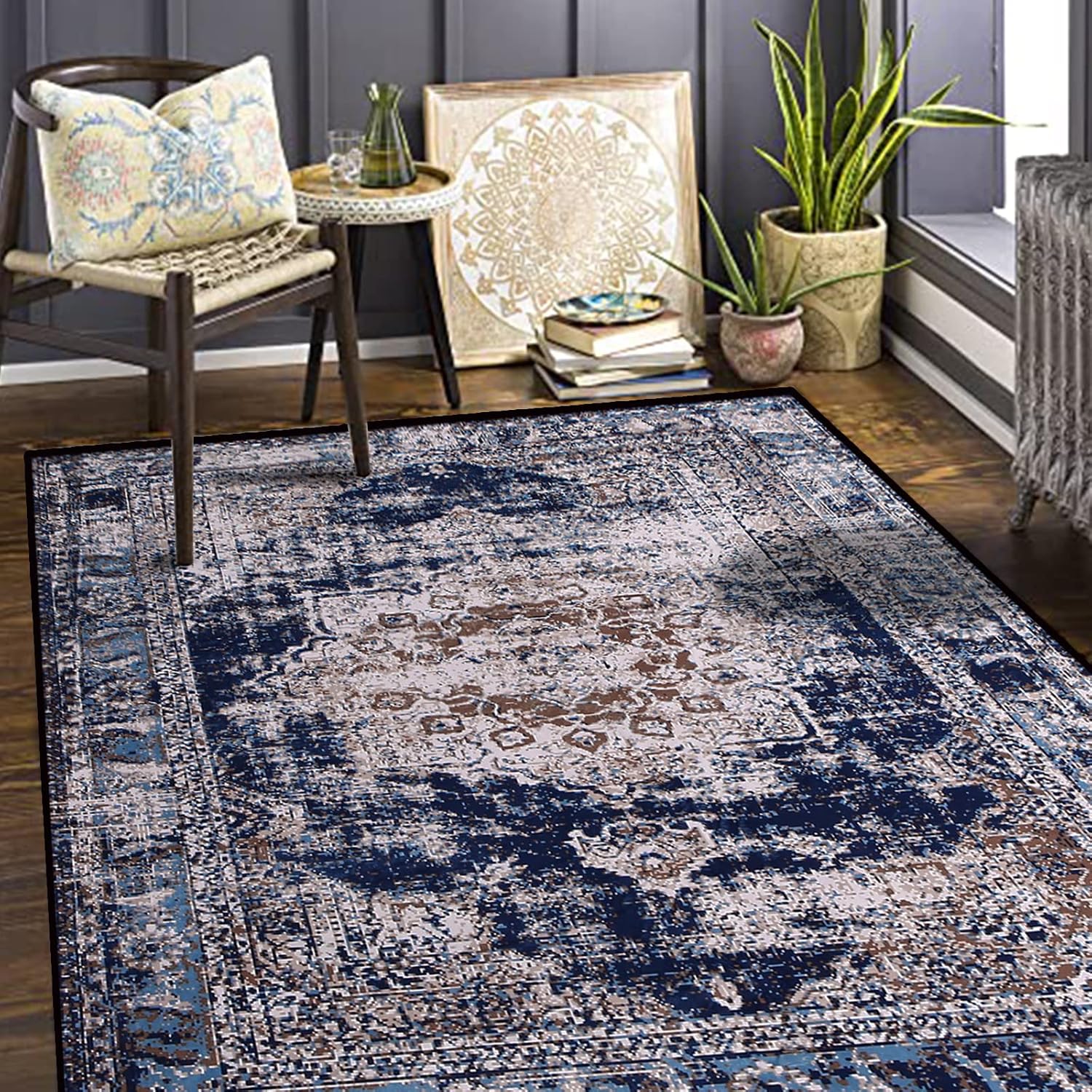 Calore Vintage Area Rugs Living Room Rug, Non-Slip Soft Short Pile Carpet for Easy Clean, Chic Traditional Rug for Living Room Bedroom Dining Room (Retro-Navy Blue, 160 x 200 cm)