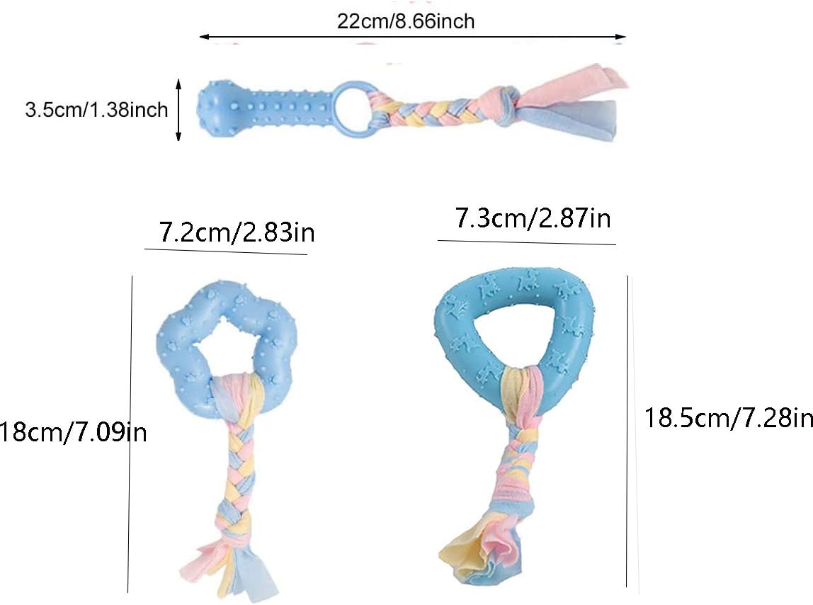 This puppy chew toys include 7 toys – 1*dog teething bone(15*7cm);1*chew ball toy with cotton rope(20*6cm), 1* Circle rope toy(18*7cm) , 1* dog style rope toy(10*6*3.5cm),1*fivestar rope toy (18.5*7cm), 1*triangle toy with rope(18*7cm),1* bone toy rope(20*3cm) for puppies , small and medium dogs, even cats.