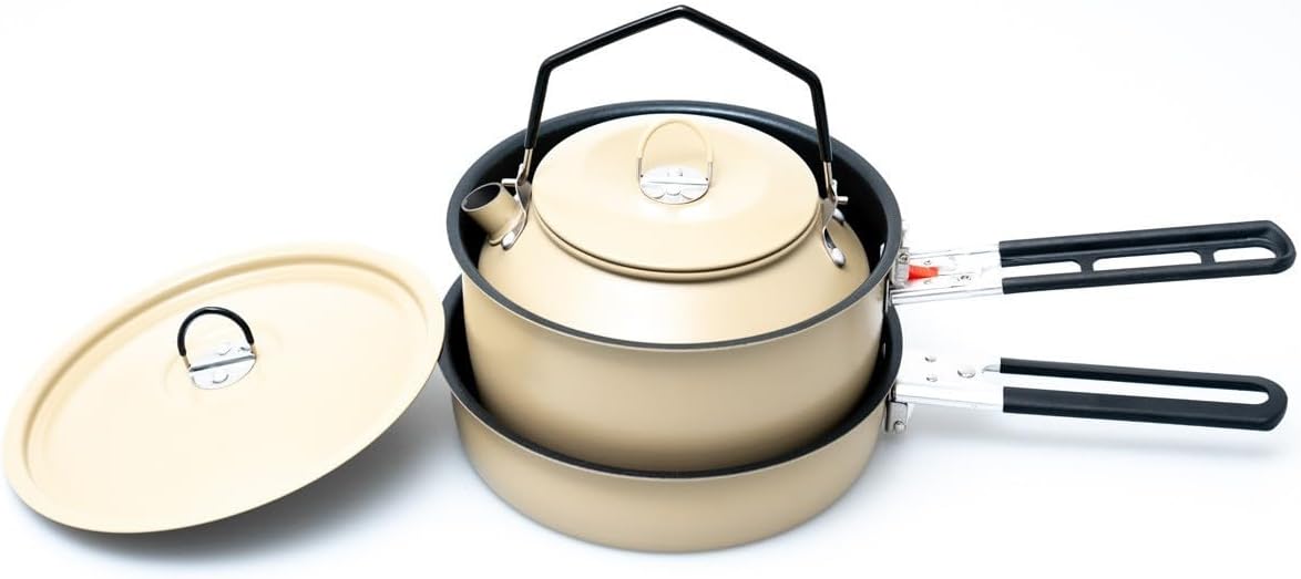 【Non-Stick and Easy to Clean】Made from anodized aluminum alloy with a non-stick coating, the camping pots, fry pan, and kettle are easy to clean and ensure even cooking.