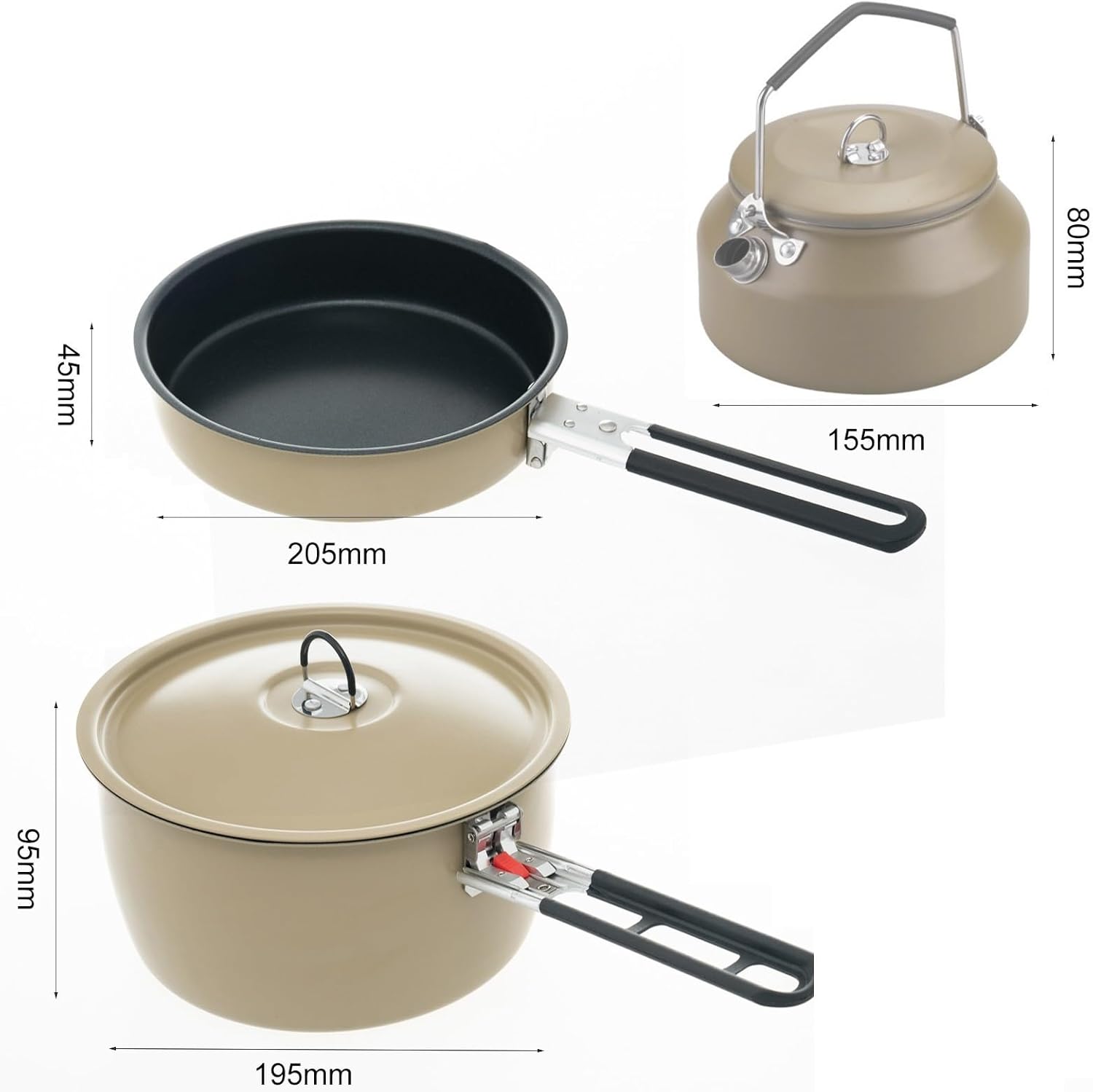 * 3-IN-1: The Camping Cookware Mess Kit includes 1 pot with lid + 1 fry pan + 1 kettle(1350ml).