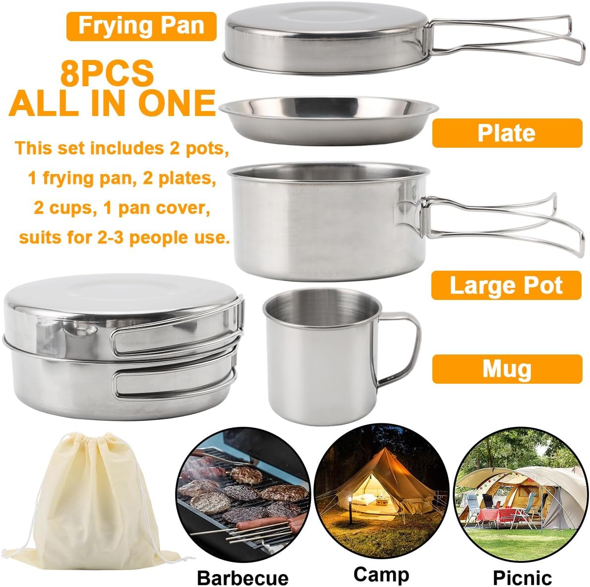 🔥【All-in-one Camping Cookware Set】: 8pcs cookware mess kit includes 2 pots, 1 frying pan, 2 plates, 2 cups, 1 pan cover, suits for 2-3 people use. Satisfying the requirement of cooking, stir-frying, boiling or frying.