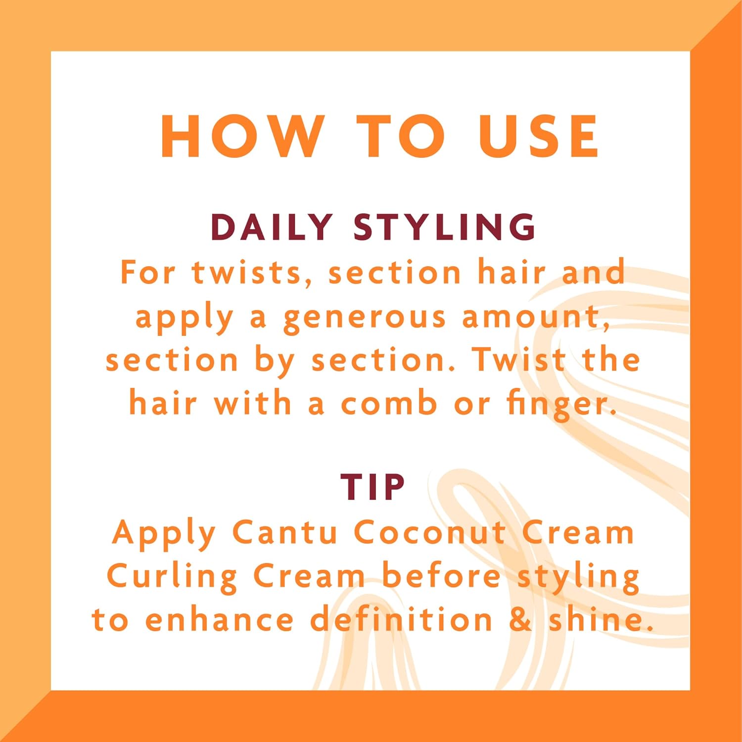 Moisturizes, de-frizzes and adds manageability to hair revealing soft, shiny twists and locks. Made with pure shea butter and formulated without harsh ingredients, Cantu restores your real, anthentic beauty. Embrace your curly, coily or wavy hair with Cantu. Directions: For Twists, section hair and apply a generous amount to each section. twist the hair with a comb or fingers. To touch up twsits or locks between cleansings, section hair and apply enough product to coat new growth. Palm roll locks or re-twist hair to touch up. Styling Tip: Apply Cantu Coconut curling cream before styling to enhance the definition and shine of a twist out.