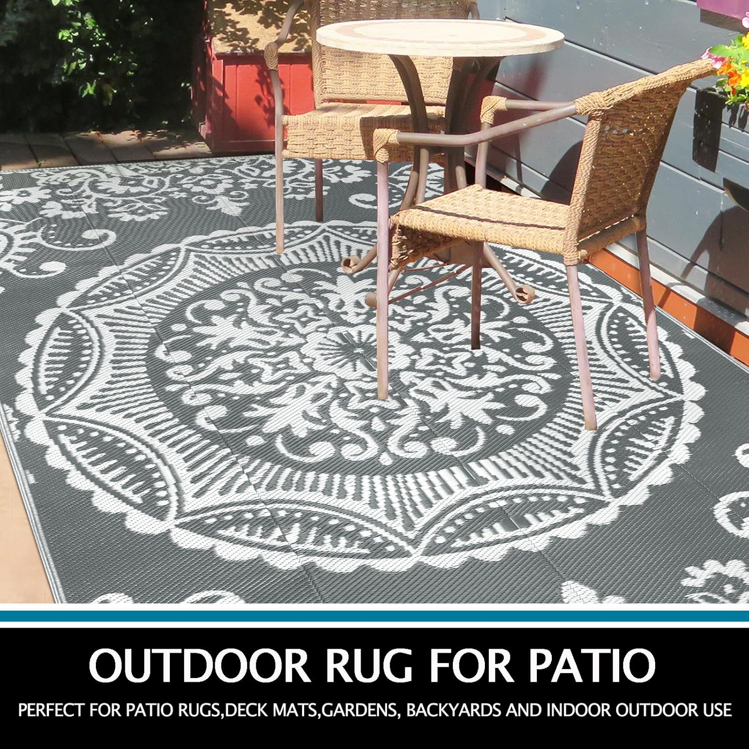 【150x245cm Reversible Outdoor Rug 】Outdoor plastic patio rug this reversible mats with a rustic boho floral design paired with classic grey&white color,add some color to your patio backyard deck,The double-sided pattern outdoor area rug design brings visual appeal to outdoor carpets and opens up more possibilities for styling and matching.