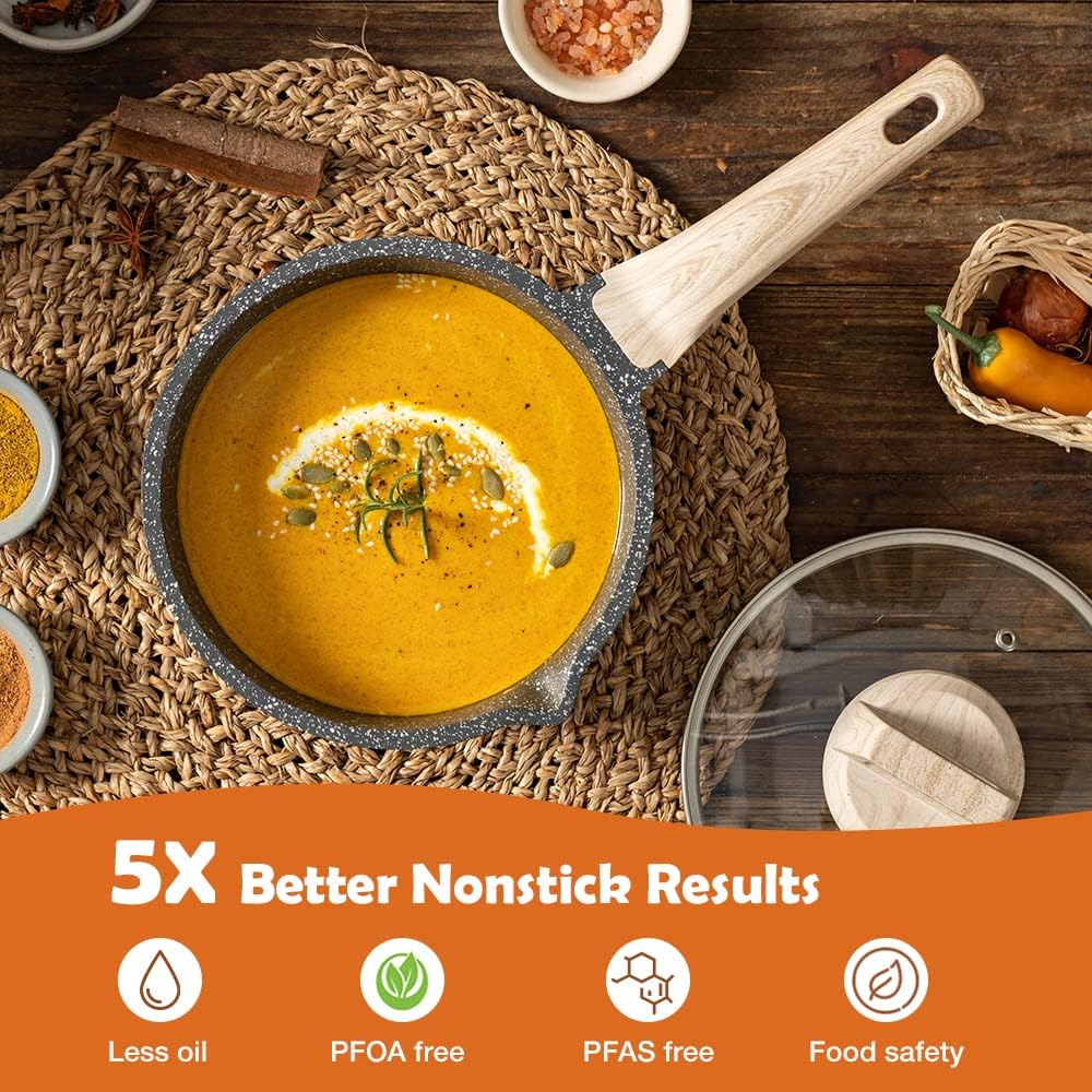 Safe Nonstick Granite: Nonstick granite material, 100% free of PFOS, PFOA, lead, and cadmium, and less oil needed & less smoke released, makes our saucepan cooking is always safer and healthy. With the excellent non stick performance, which keeps food sliding smoothly along the surface for easy cooking and cleaning.