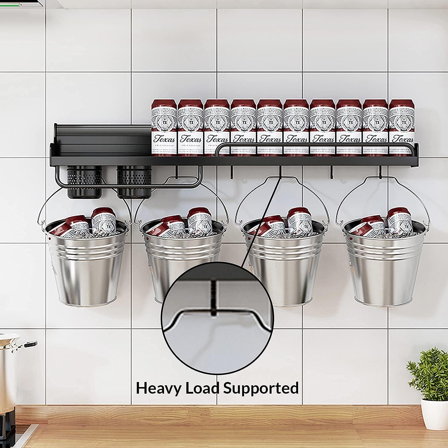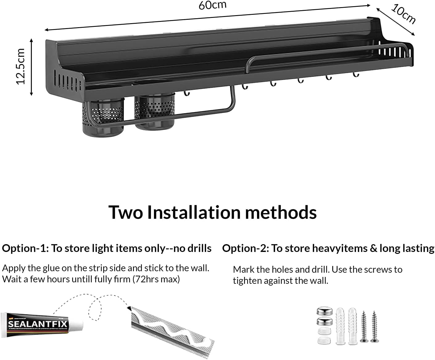 ✅ FAMILY SIZE: Space efficient utensils holder wall mounted, kitchen rack with hooks 60cm/23.6inch Length x 12.5cm/4.9inch Width x 10cm/3.9inch Height is a large kitchen organiser shelf for your utensils, cutleries, chopsticks, spoons, small pots and pans, herbs, and spice jars.