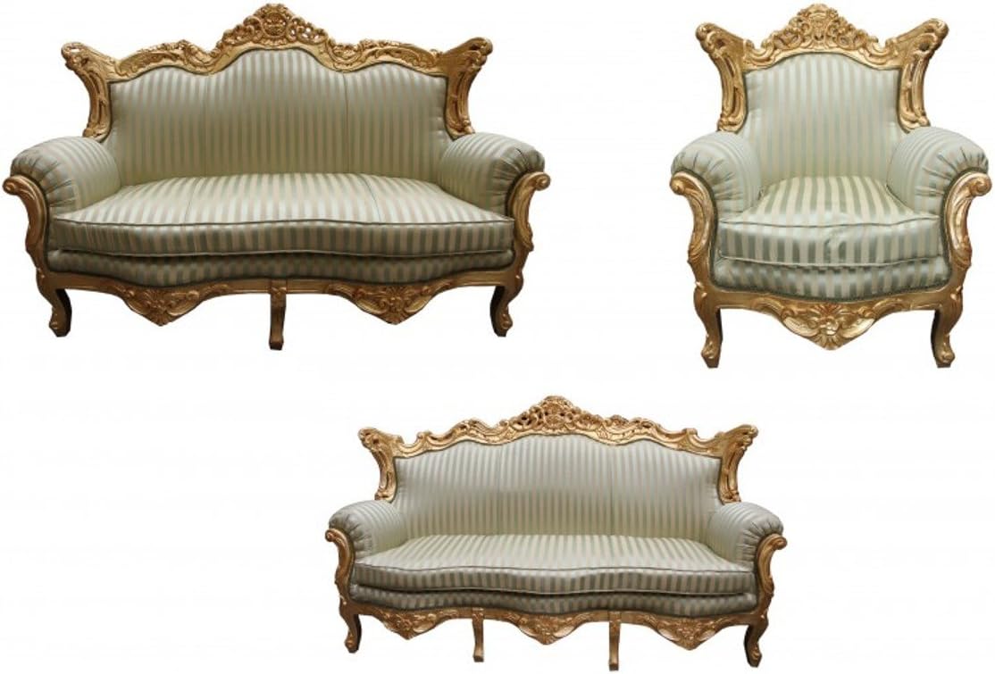 Baroque Living Room SetConsisting of: 3 seater Width approx 210 cm height 135 cm depth ca ca 90 cm Seat height approx 52 cm 2 seater Width about 182 cm height 125 cm depth ca ca 60 cm Seat height approx 52 cm 1 x living room chairs Width: 85 cm Height: about 127 cm Depth: 65 cm Seat height: 52 cm Color: ade green pattern / Gold Covered with a fine Satin fabric (60% polyester 40% cotton) Filling: 100% Polyurethane foam padding Brand: Casa PadrinoCasa Padrino is a registered trademark with the German Patent and Trademark OfficeThis item is an authentically handcrafted antique style replica. Color deviations, small cracks, flaking, antique traces, crooked rivets, bumps and other antique style features are part of the article and make each piece of furniture unique.