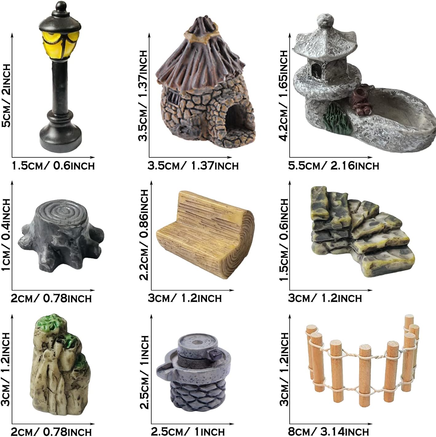 Package include: 26 PCS mini zen garden accessories, 1 x Stone grinding, 1 x Stone steps path stair, 5 x Tree model, 1 x Bench chair , 1 x Wood log stump, 1 x Mini log fence, 1 x Rockery garden, 1 x Tower pool, 1 x Mini house, 1 x Lamp post, 1 x Lawn, 3 x Moss ball, 8 x Cobblestone.