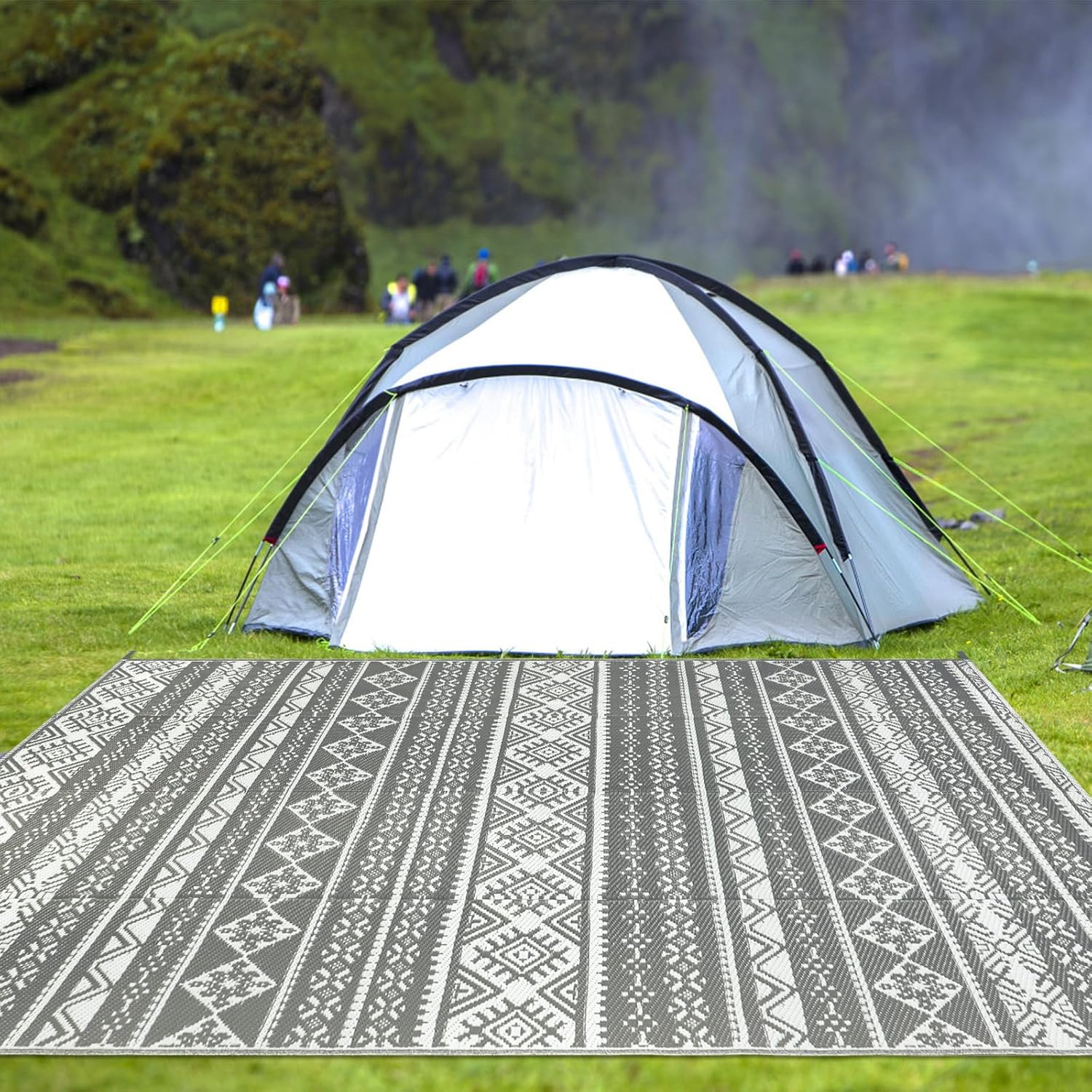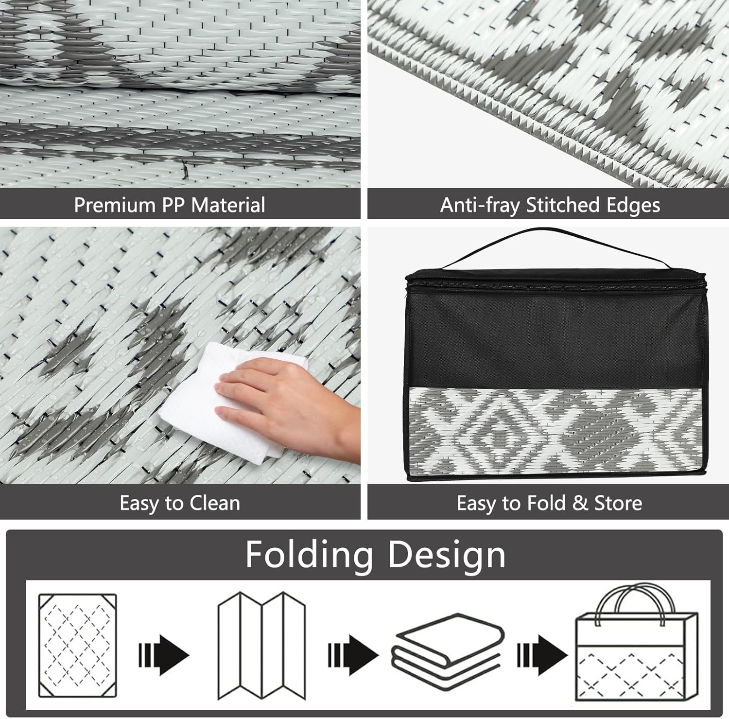 REVERSIBLE & PORTABLE: The patio outdoor rug is reversible and budget-friendly, it allows you to have two different looks in a matter of seconds, and show off your personal style without spending another fortune. Foldable design makes it an ideal choice for a variety of outdoor activities, and convenient to store.