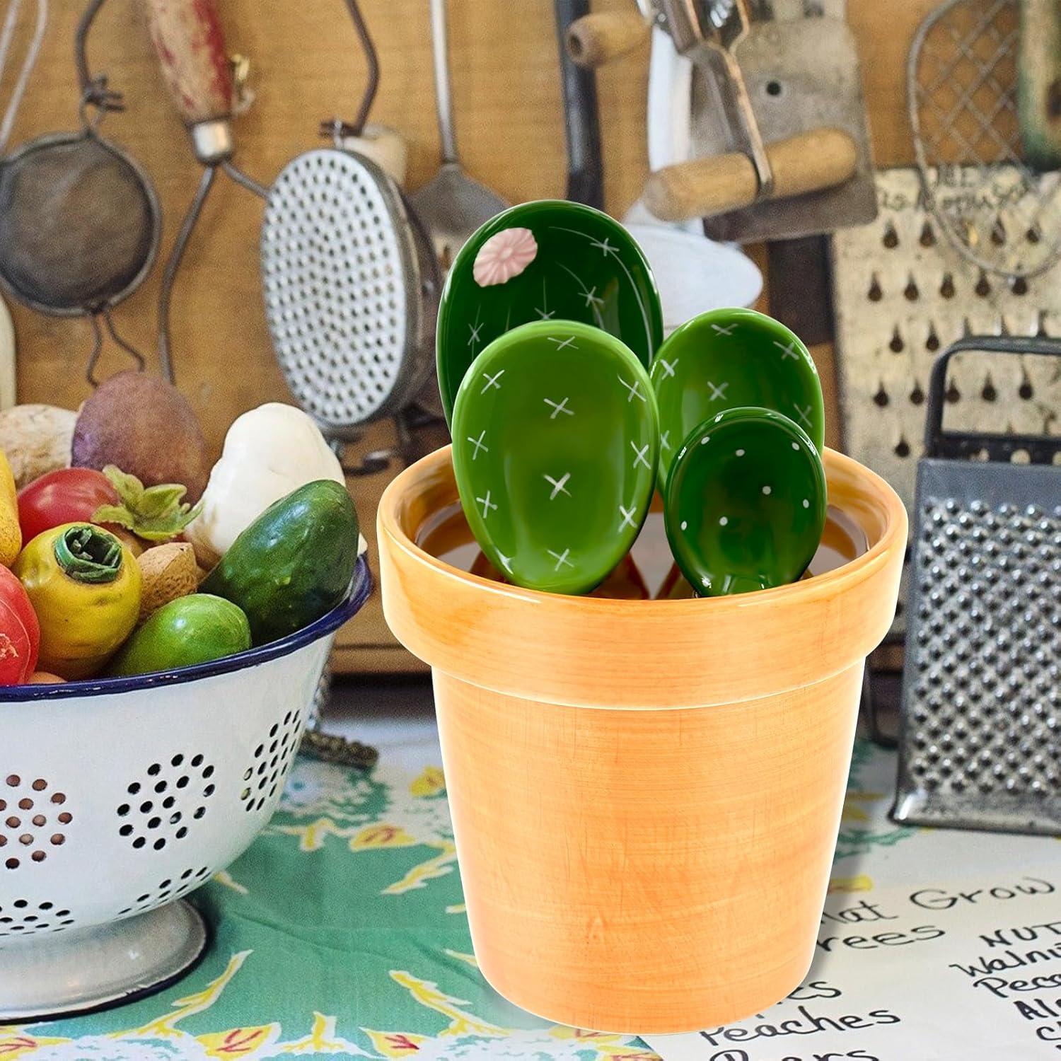 Ceramic Cactus Measuring Spoons set in pot organizer, 5 Pieces cute measuring cups and spoons set for kitchen dry wet measuring Liquid food salt and sugar kawaii Spoon with base cup (Green)