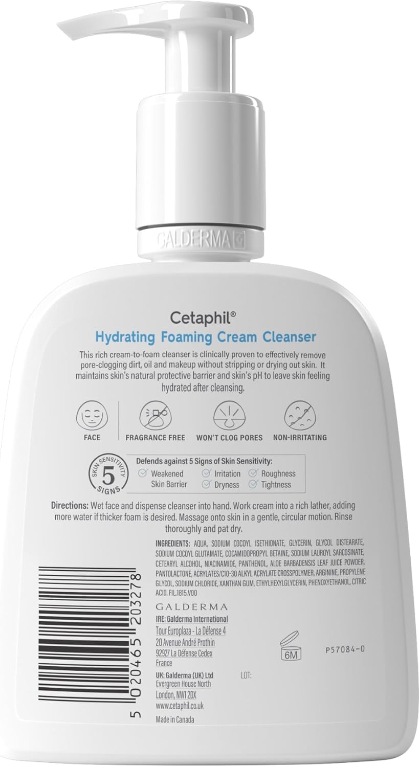 Cetaphil Hydrating Foaming Cream Cleanser, 236ml, Face Wash with Niacinamide for Normal, Dry or Sensitive Skin, Vegan-Friendly