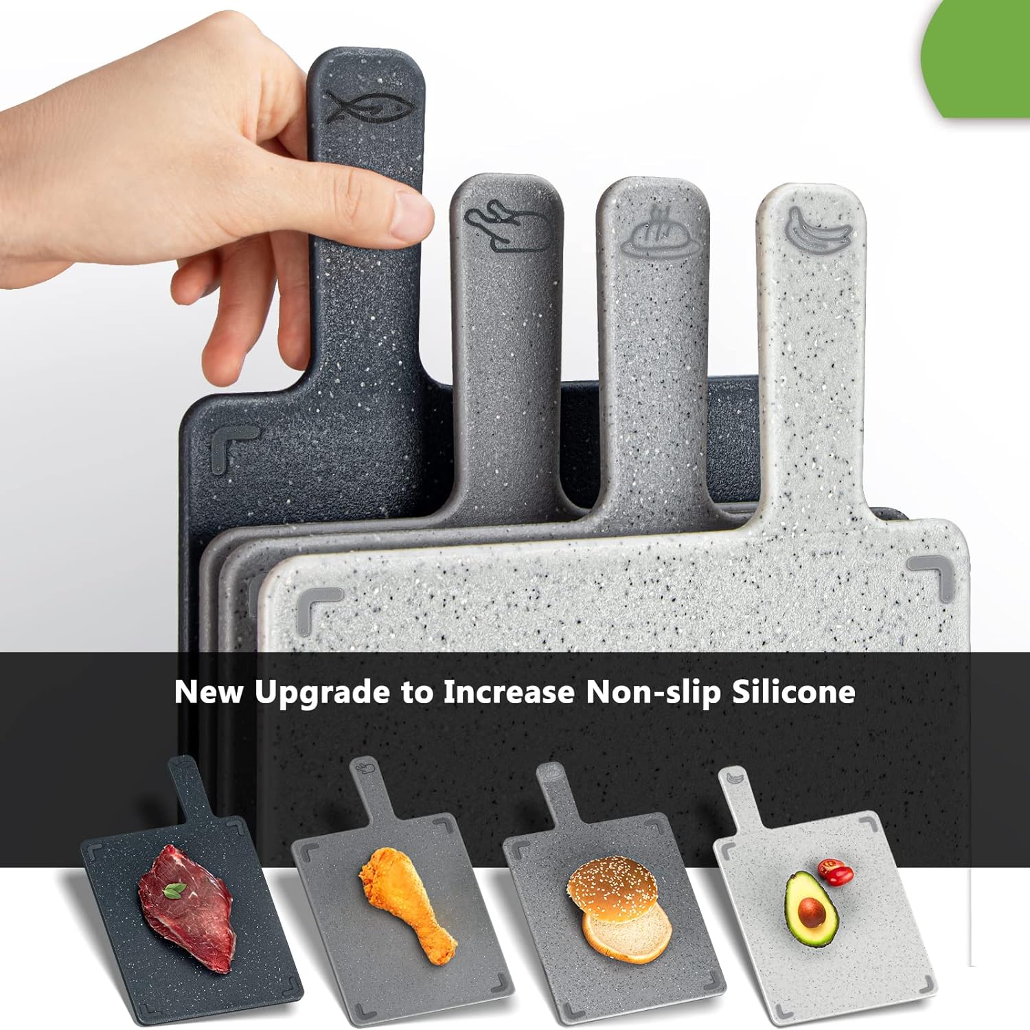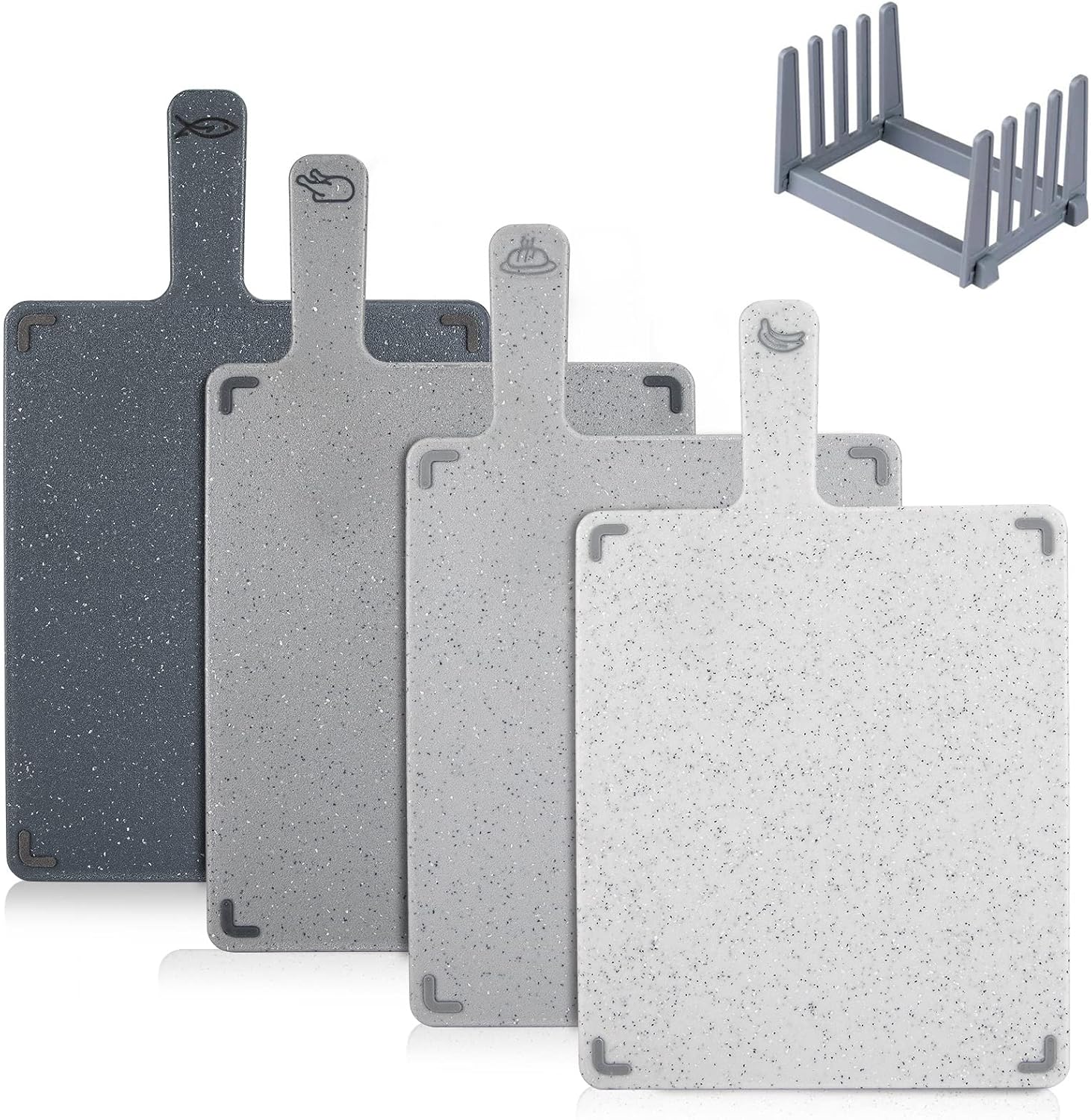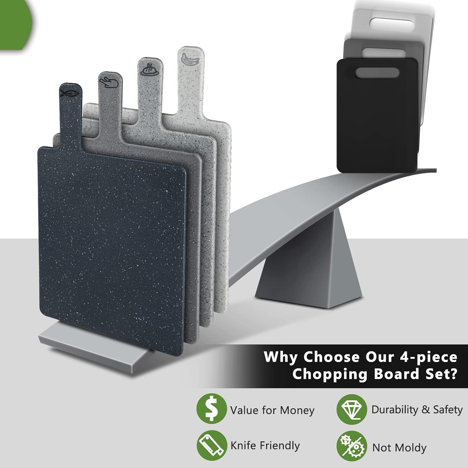Chopping Board Set, Plastic Colour Coded with Stand, Dishwasher Safe, BPA Free, Durable Kitchen Cutting Boards, Small Serving Tray for Camping, Flexible Easy Grip Handle for Meat, Veg (Grey)