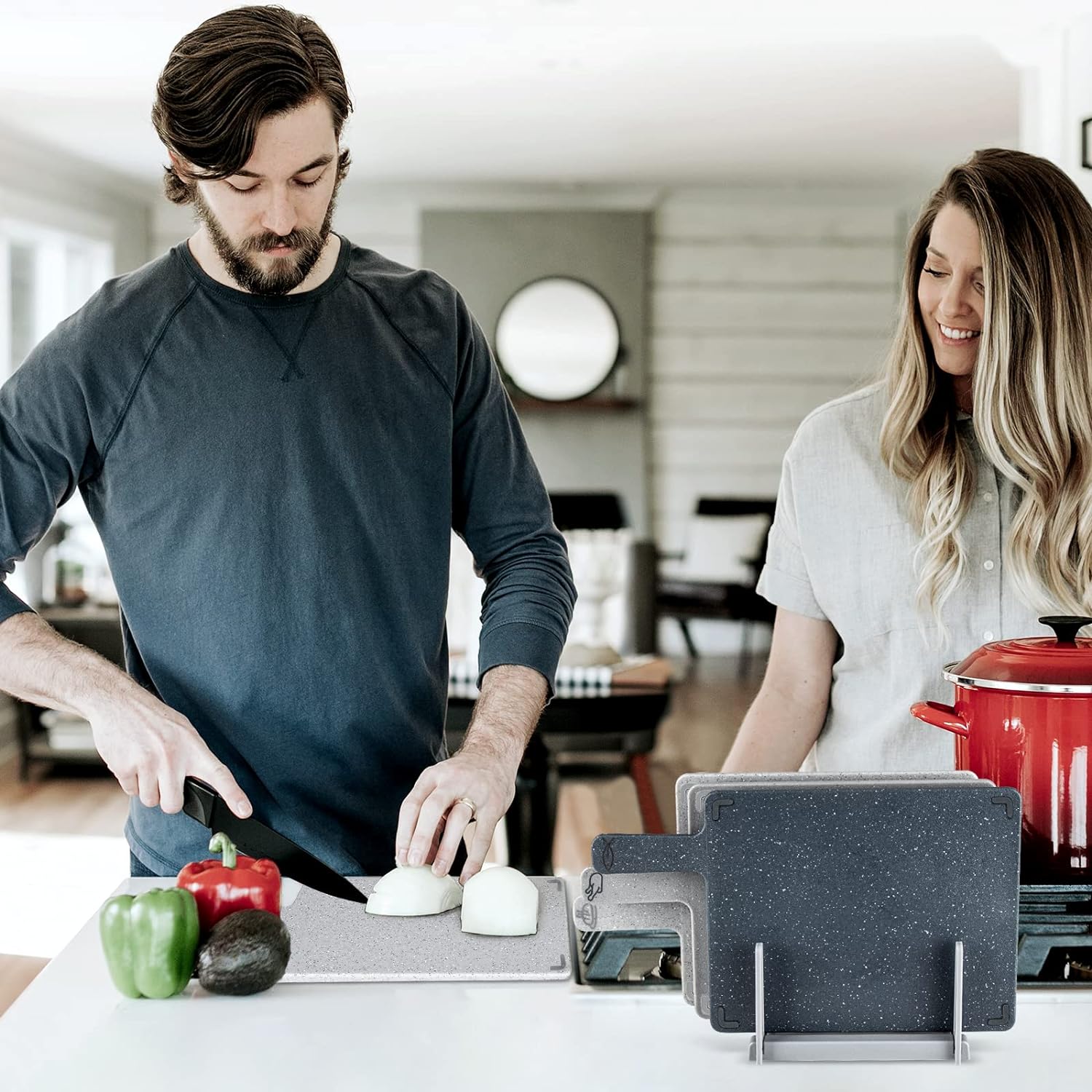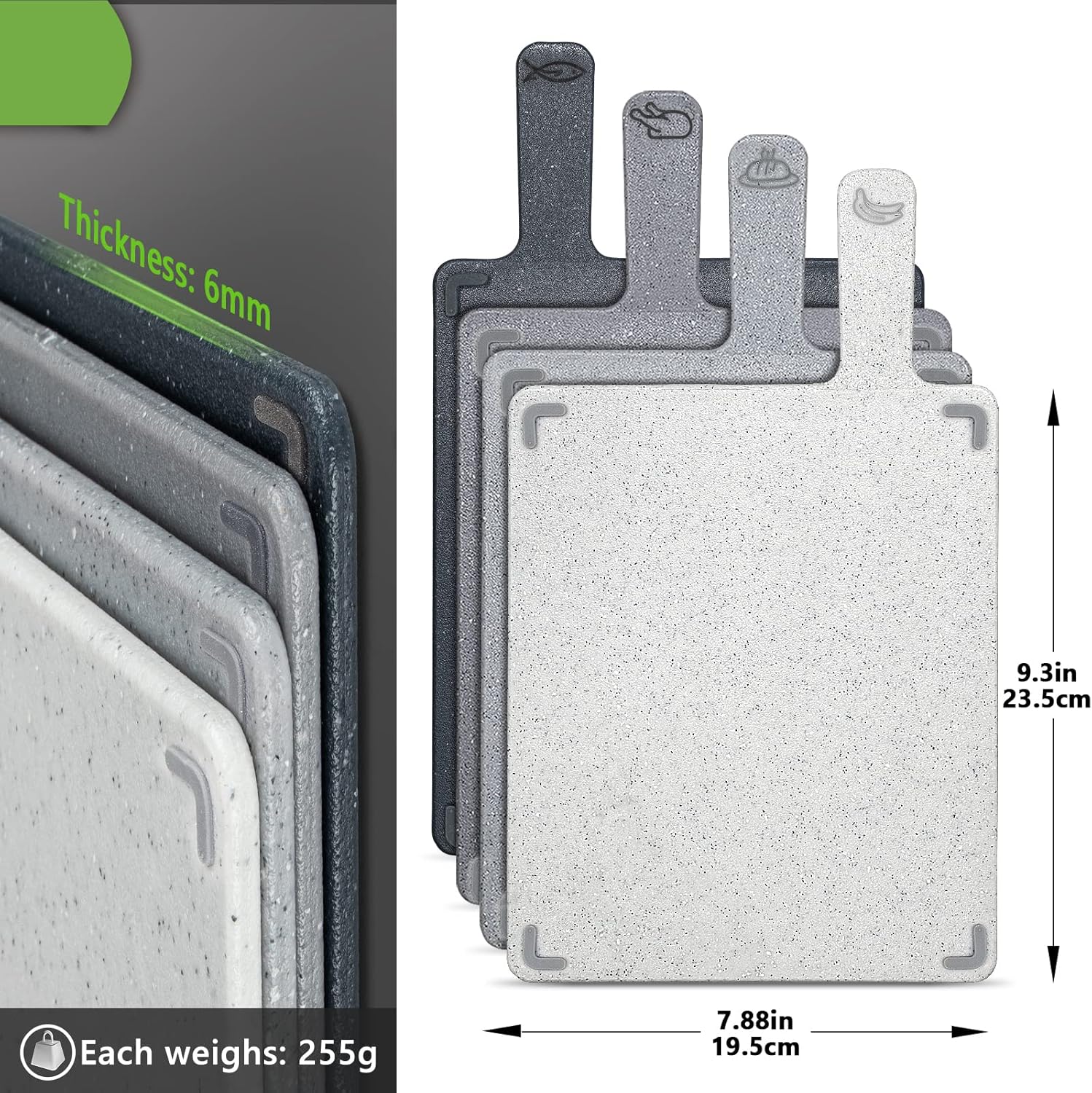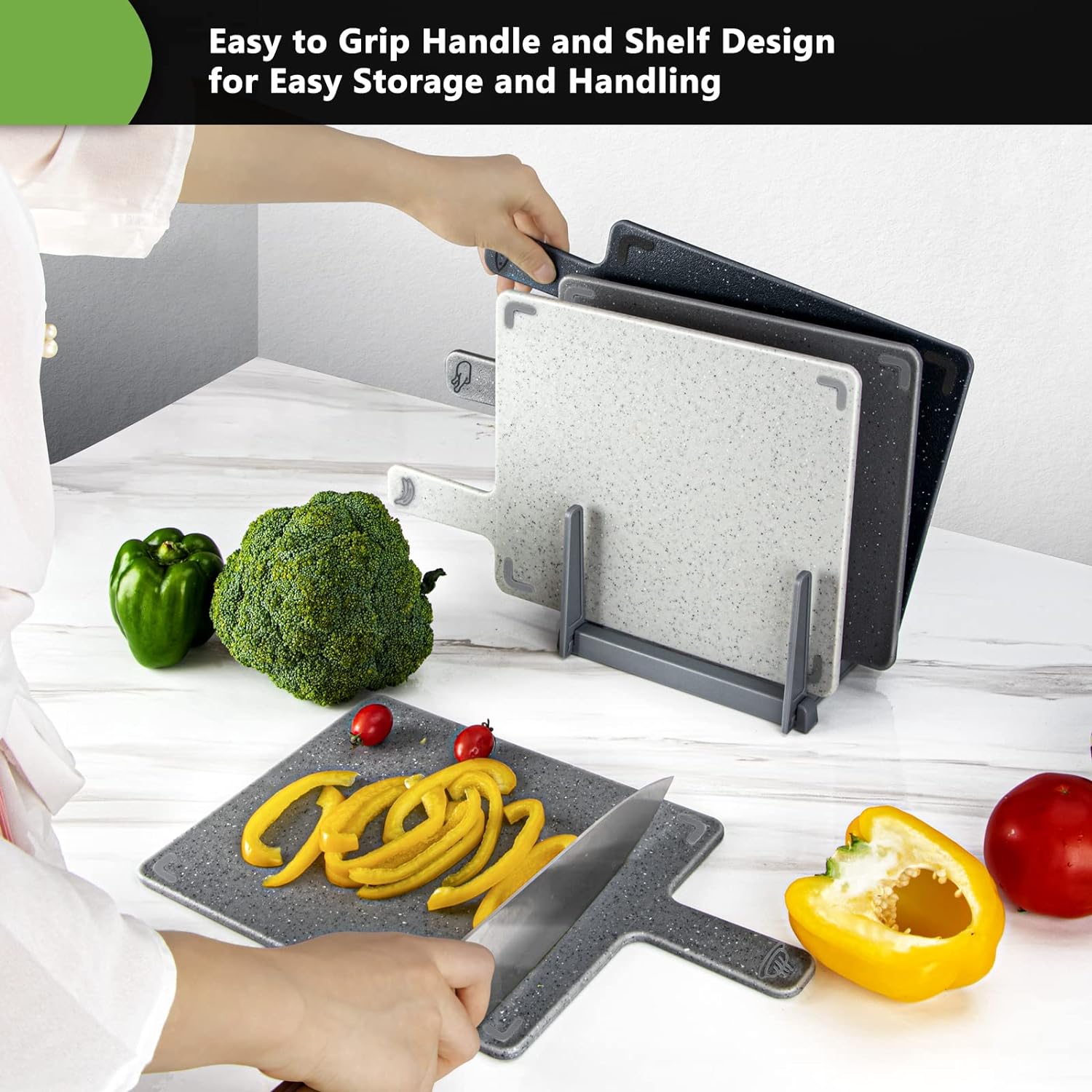 Chopping Board Set, Plastic Colour Coded with Stand, Dishwasher Safe, BPA Free, Durable Kitchen Cutting Boards, Small Serving Tray for Camping, Flexible Easy Grip Handle for Meat, Veg (Grey)