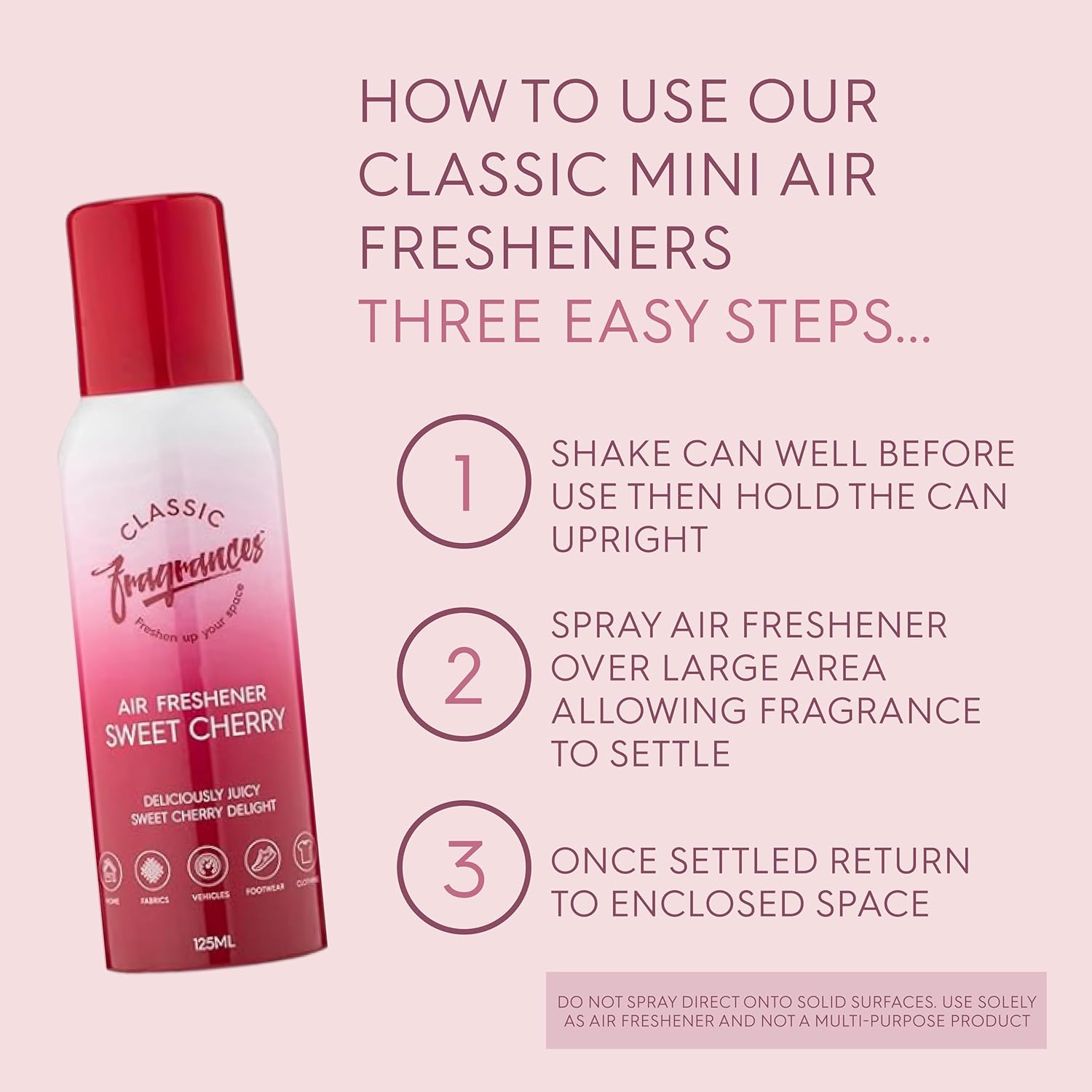 Classic Fragrances Assorted Aromas Air Fresheners Sprays 4 Pack – 125ml Long-lasting quick-release spray air freshener. Classic Fragrance cans are the perfect way of freshening up your space. Classic Cherry – Deliciously juicy sweet cherry delight.