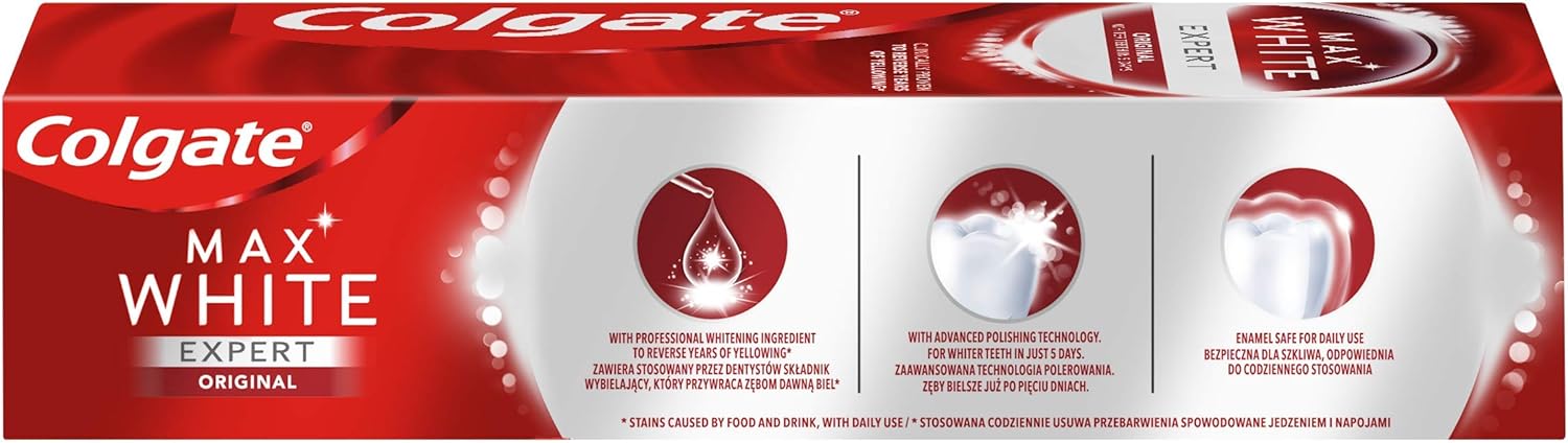 Colgate max expert white cool mint toothpaste is professionally designed to reverse years of yellowing. Significant reduction in stains cause by food and drink. Legal Disclaimer Contains: Sodium Monofluorophosphate Box Contains 1 x Colgate Expert Max White Cool Mint Toothpaste 75 ml