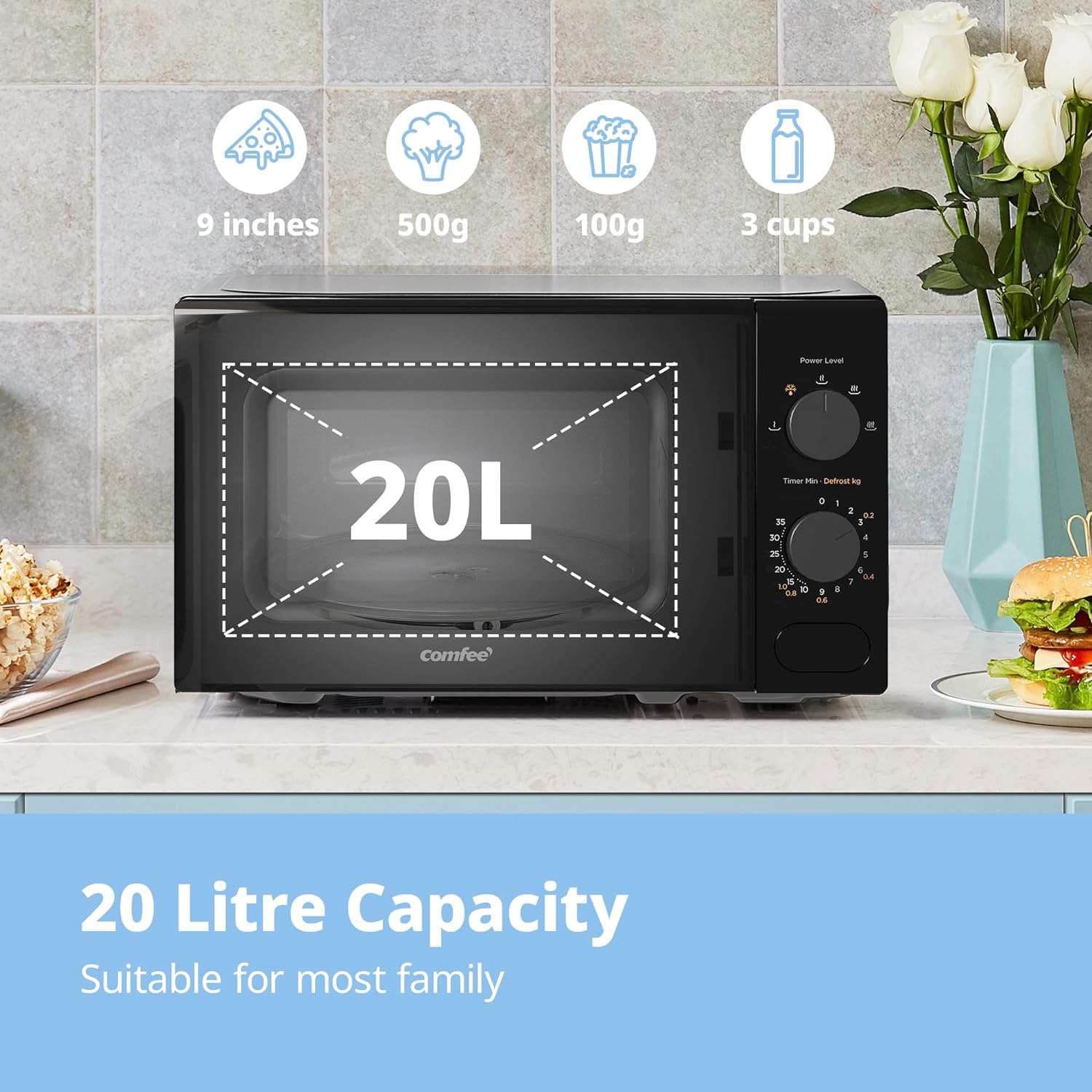 COMFEE’ 700W 20L Black Microwave Oven With 5 Cooking Power Levels, Quick Defrost Function, And Kitchen Manual Timer – Compact Design CM-M202CC(BK)