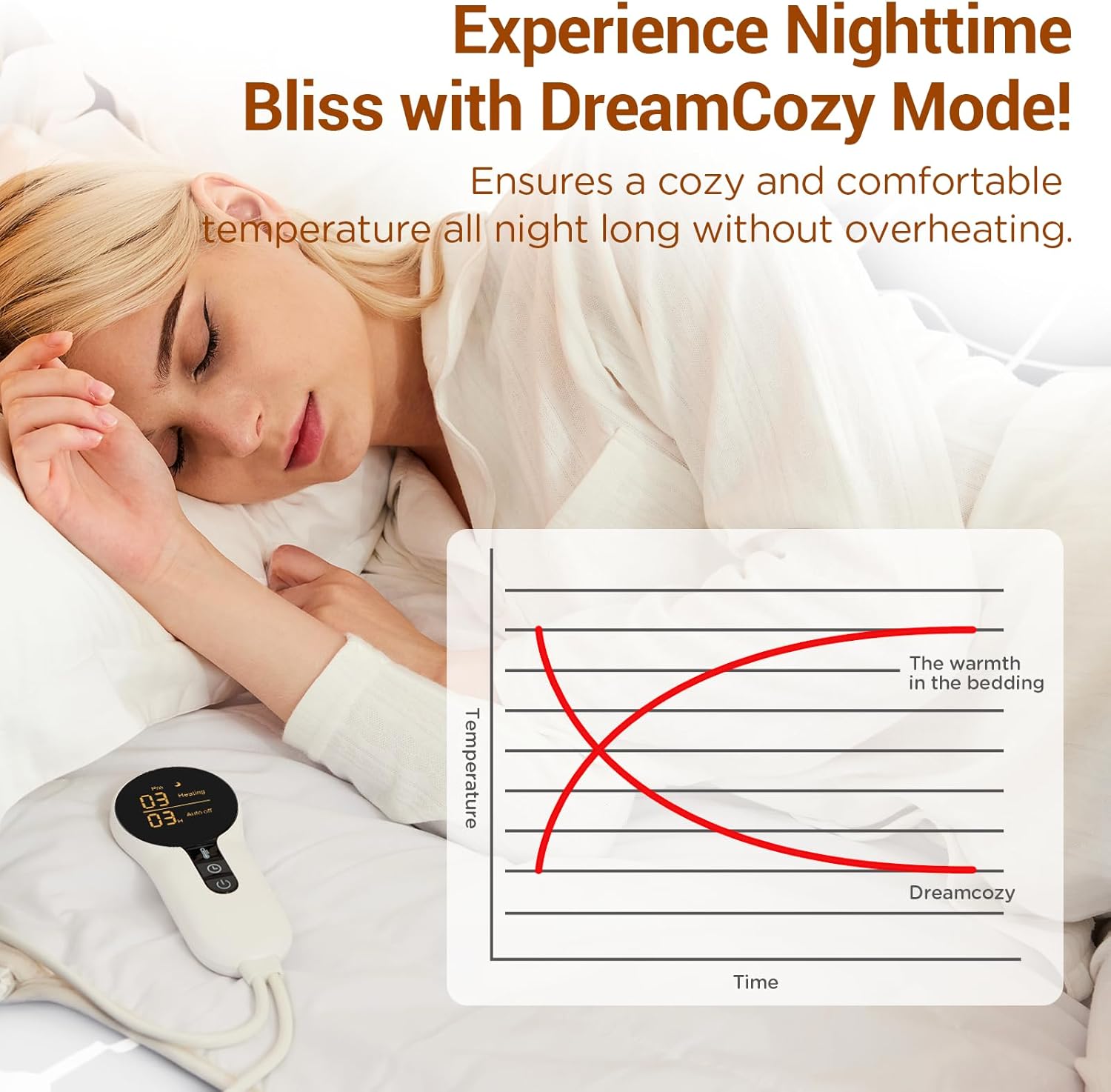 Unlock the Wonders of DreamCozy Mode: Revolutionizing the electric underblanket experience with intelligent downshifting, bid farewell to waking up in discomfort from excessive heat. Easily activate this mode with a long press of the temperature button. After an hour, the bed heating pad will seamlessly lower the setting by 1 level. Moreover, enjoy enhanced safety with the automatic shut-off function, customizable for a countdown of 1 to 12 hours.
