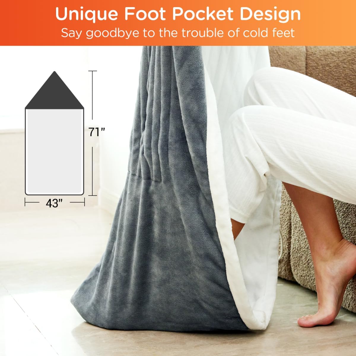 Cozy & Stylish Design: Comfytemp bed throw blanket with feet pockets featuring double-sided design in different colors, double 210GSM flannel provides incredible comfort while working efficiently to preserve heat with excellent heat penetration and preservation. The small heated blanket foot warmer for bed is super soft cozy and stylish, you can use it whether you’re in the bedroom, office, sofa, or carpet.
