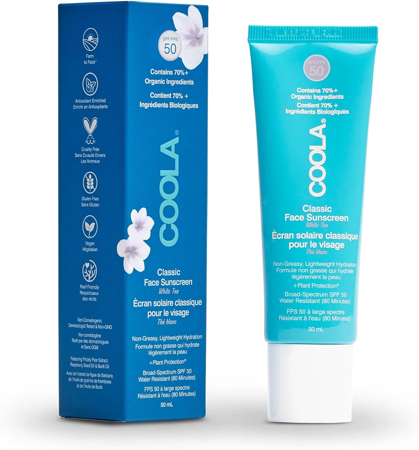 Key benefits 70%+ organic sun cream SPF 50||Broad spectrum SPF 50 UVA/UVB protection Water-Resistant (80 minutes) COOLA sunscreen Face cream designed for active days in the sun, but light enough for daily use Antioxidant enriched face sun cream Vegan||Hawaii Reef Compliant (Act 104) Free From Oxybenzone & Octinoxate