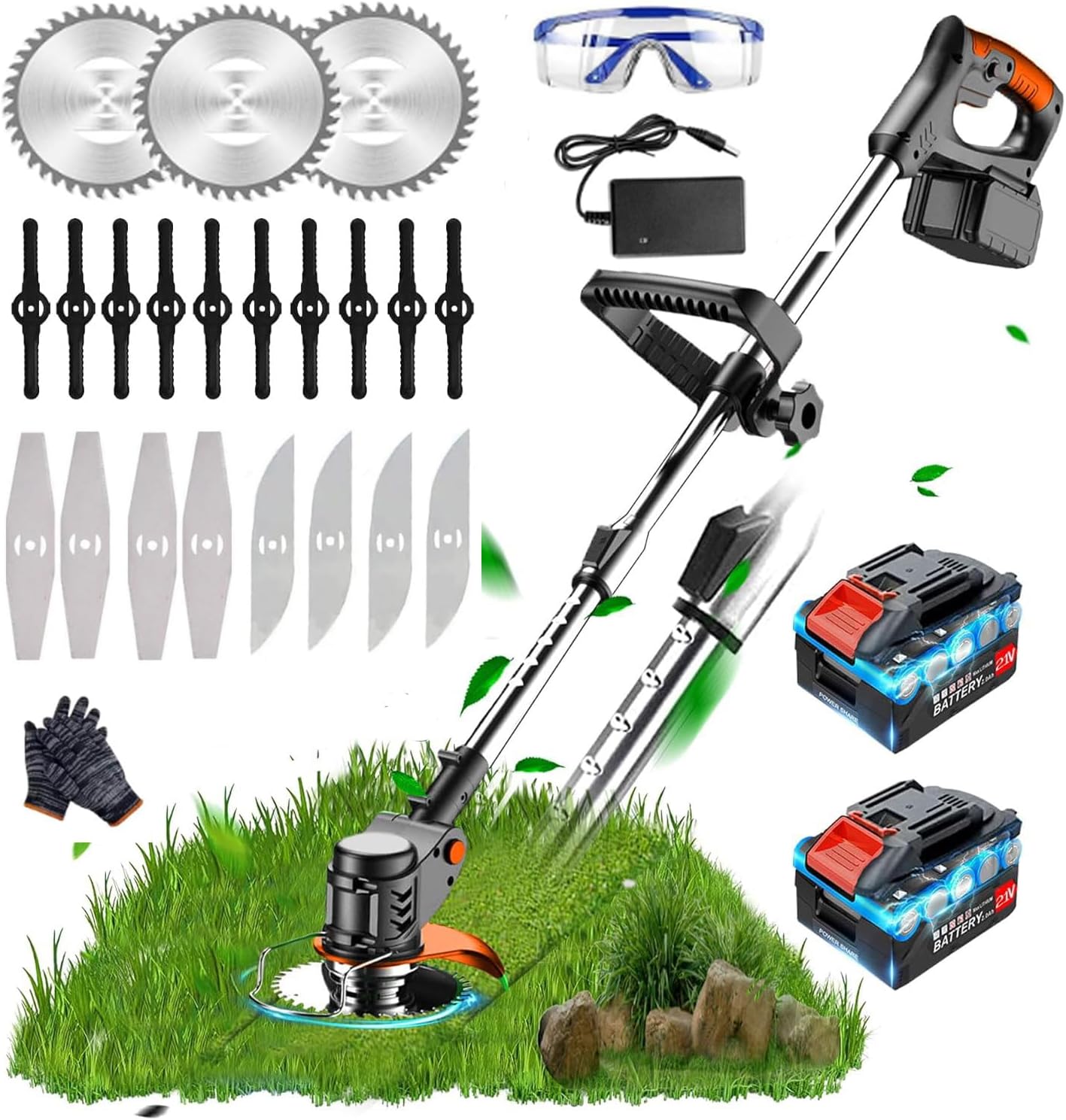 【What You Will Get 】1 x Cordless Strimmer, 2 x 21V batteries, 3 x Saw blades, 4 x Tainless steel S- blades, 4 x tainless steel blades, 10 x Plastic blades, 1x User manual, 1 x Fast charger, 1 x Protective work gloves, 1 x Safety goggles.