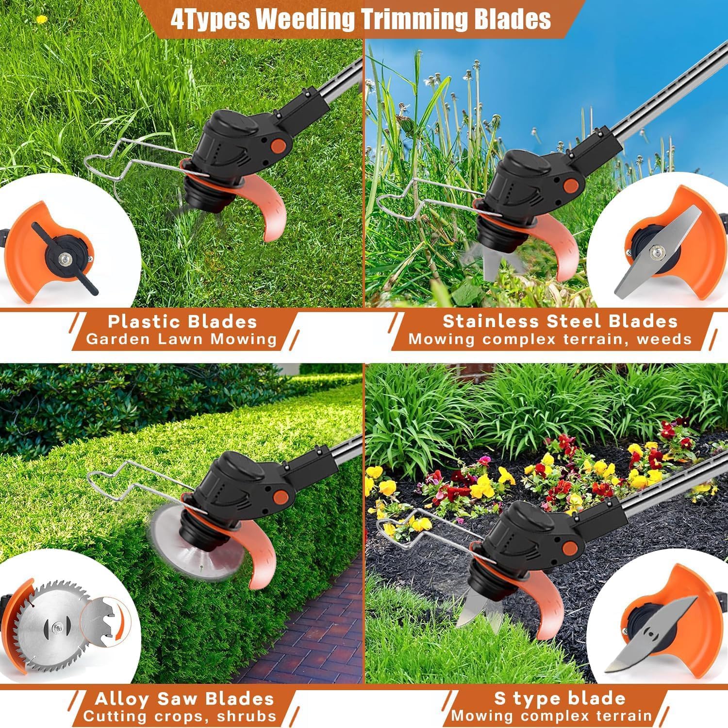 【4 Types of Blades】Electric strimmer cordless has different blades meet different weeding needs. Plastic blades are suitable for soft lawns, stainless steel blades are well for older weeds, and alloy saw blades are great for branches, you clean your garden quickly and easily,lawn trimmer saving much time and effort to weed as well.