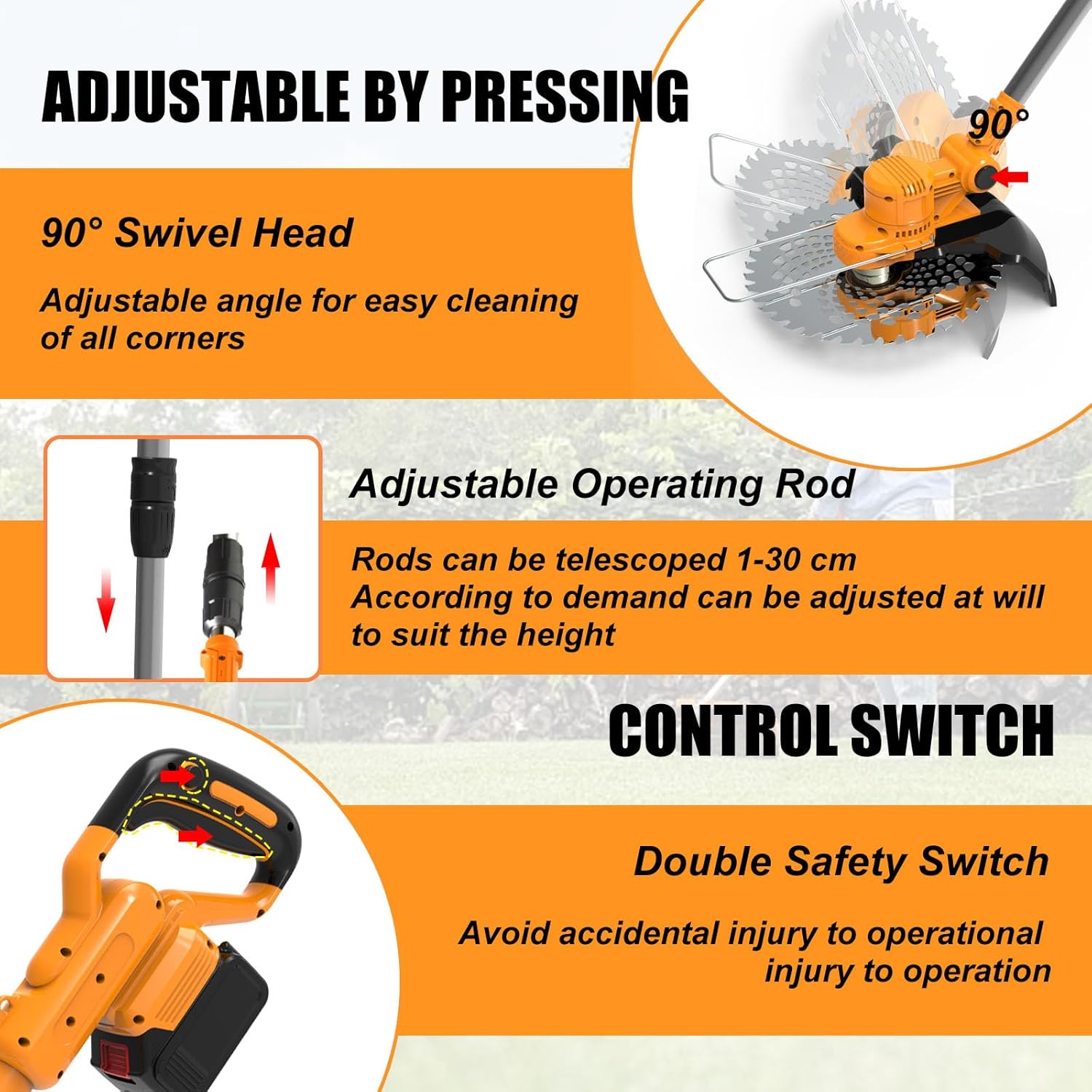 Adjustable Cutting Head: The weed wacker uses a 90° rotating cutting head. The string trimmer can easily reach all lawn edges, whether it is sloped or in a narrow space. It is an efficient and reliable helper for keeping lawns, paths and flower beds clean, as well as for mowing lush grass brushes for yards or gardens.