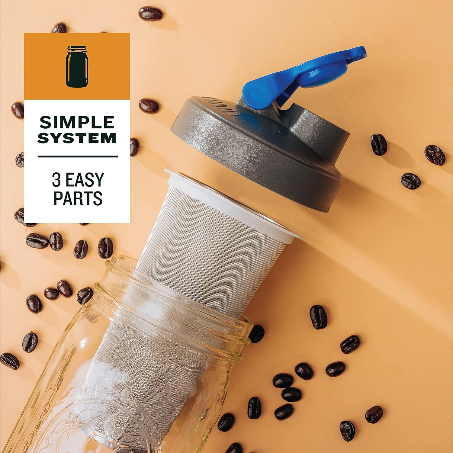 EASY TO USE Simply pour coarse ground coffee into the filter basket, add water and allow to steep for 24 to 48 hours. Remove the filter basket and discard the grounds and you have delicious coffee concentrate. All components are dishwasher safe. CREATE CONCENTRATED BREW Our large filter basket allows a highest ratio of coffee grounds to water for any large cold brewer. The silicone seal allows you to shake the jar during the brewing process ensuring that all of the grounds are completely wetted. HIGH QUALITY MATERIALS Rather than use fragile borosilicate glass, our jar is a Ball 1 quart mason jar. The filter is made from heavy gage, food grade stainless steel wire that will not bend or dent. Other coffee makers use thin, easily damaged stainless steel cloth. VERSATILE BREWER Because we use a standard mason jar, you can add your own jar to the system to brew one batch while drinking another. This system can also be used to make hot tea or sun tea with loose leaf teas and infuse water with fruits or oils with spices. COLD BREWING BENEFITS Cold brewing coffee prevents the formations of acids that create bitterness and obscure the flavors of the coffee. The low acid content of the coffee is also a benefit for reflux sufferers. In addition, the stainless steel filter allows the aromatic oils of the beans that are removed by a paper filter to pass through into the coffee further improving the flavor.