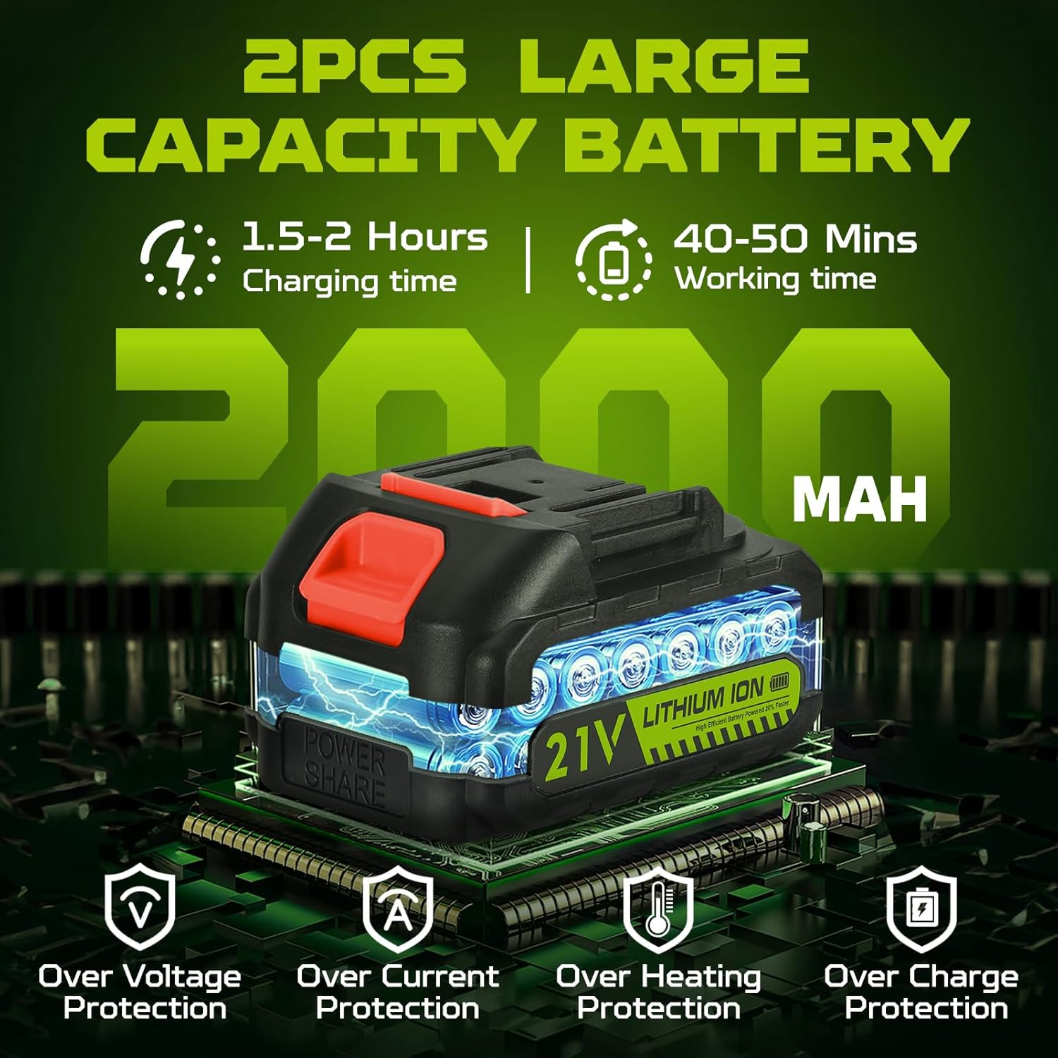 ✔✔【2 Rechargeable Batteries for Added Convenience】This electric chainsaw comes equipped with 2x 2000mAh rechargeable batteries, allowing you to switch to a spare battery when one runs out of charge. Ideal for tackling troublesome garden weeds, each battery takes 2-2.5 hours to fully charge and provides 40-50 minutes of operation time.