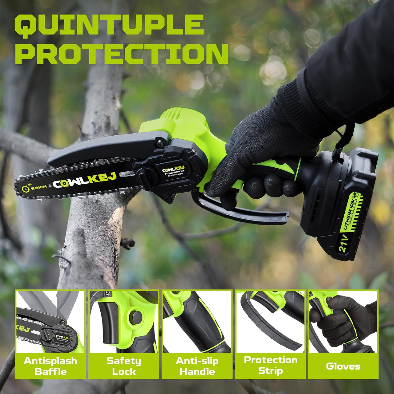 ✔✔【Five-fold Protection for Enhanced Safety】①High-quality chains have been upgraded to ensure a seamless cutting experience. ②Switch protection and a safety lock prevent accidental injuries. ③A uniquely designed safety splash guard offers protection during logging and branch trimming. ④A protective strip shields hands from scratches whilst cutting wood. ⑤Non-slip safety gloves provide a comfortable grip.
