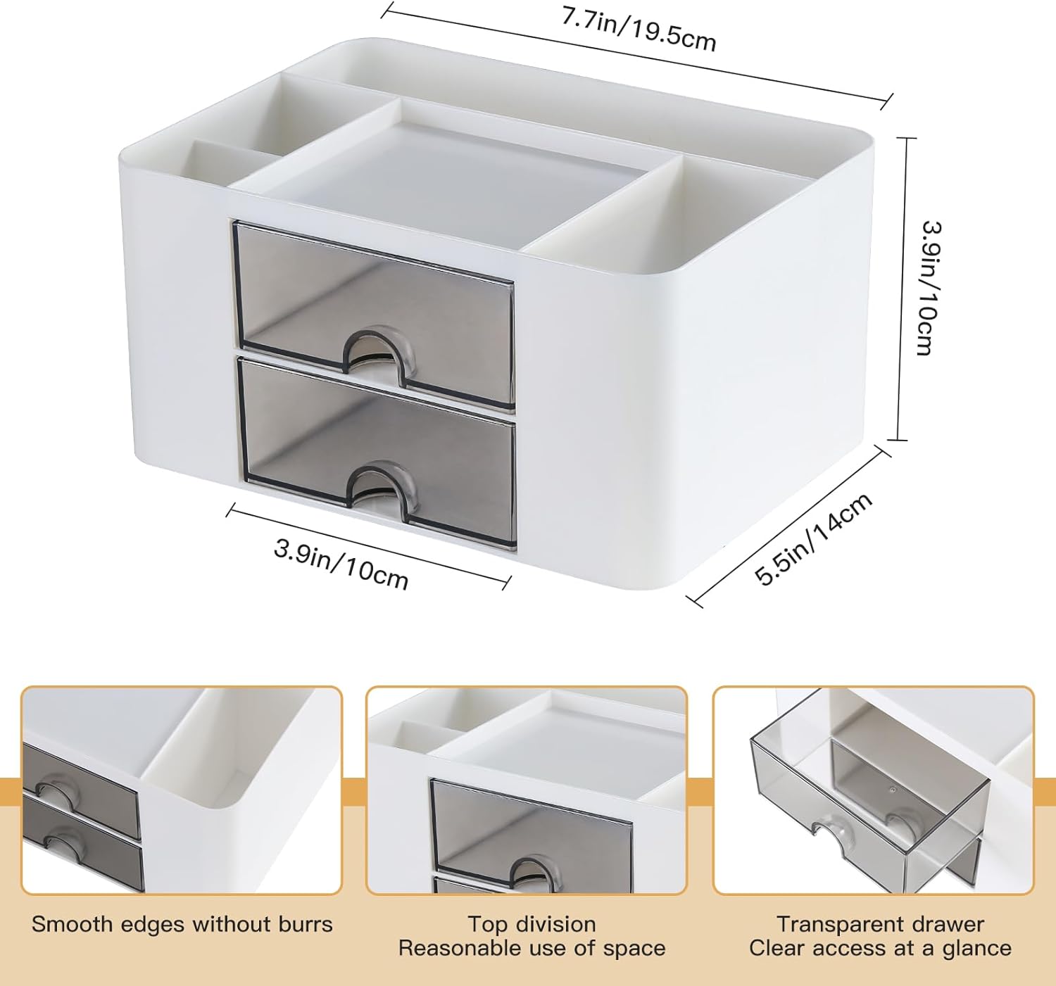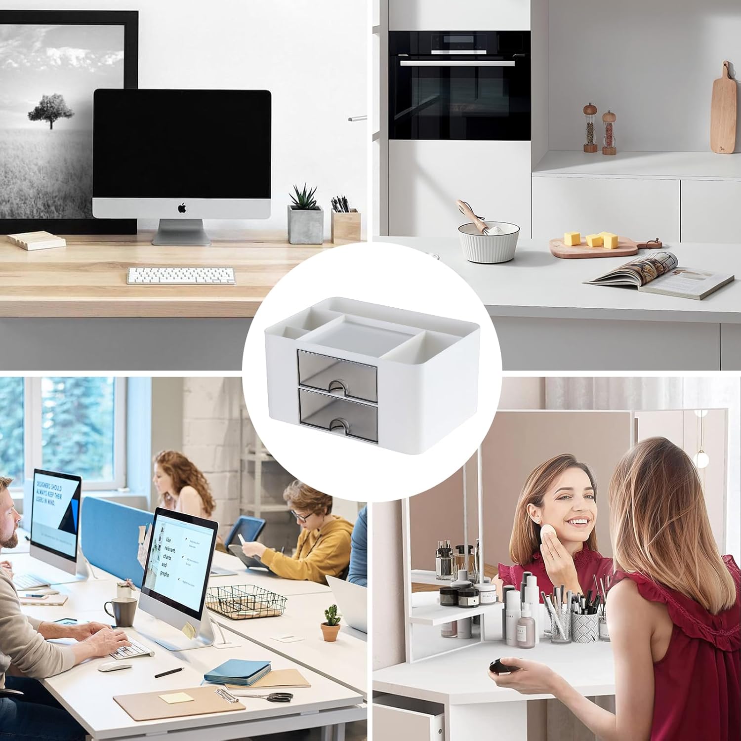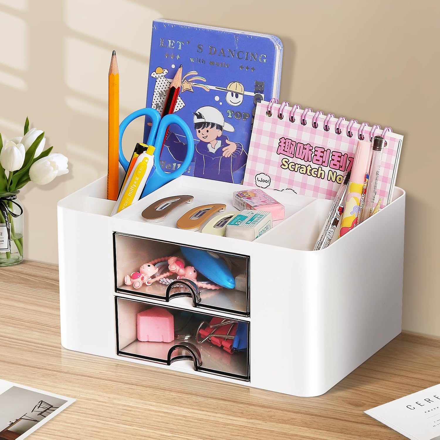 Practical Combination: The desktop storage box presents a practical combination of 5 compartments and 2 transparent drawers. This versatile setup lets you efficiently sort and store everyday items such as pens, sharpeners, staplers, scissors, rulers, glue sticks, folder holders, notes, lapel pins, and more. Ideal for achieving a cleaner and tidier room, catering to both desk organiser and desk supplies organisers needs.