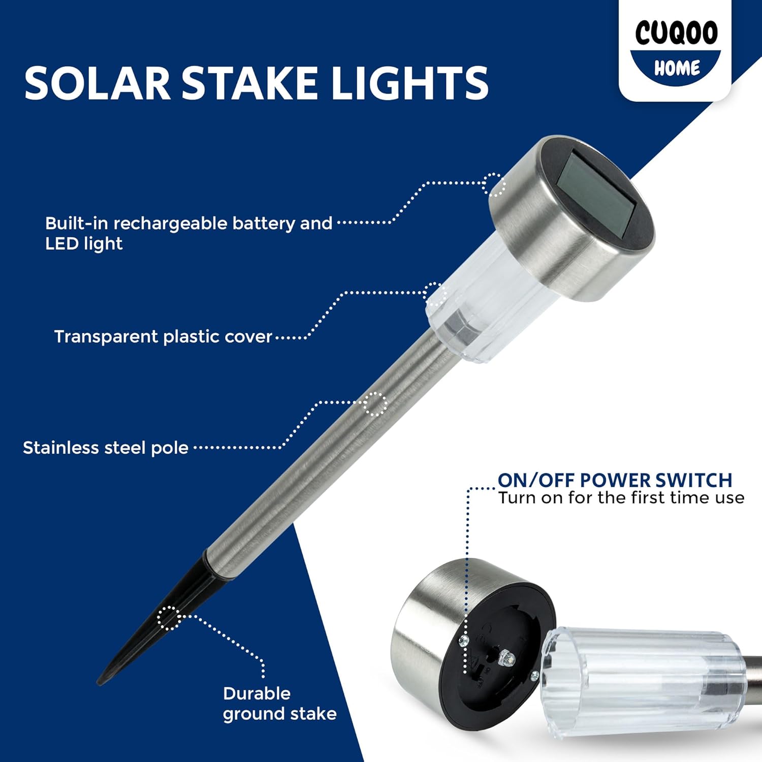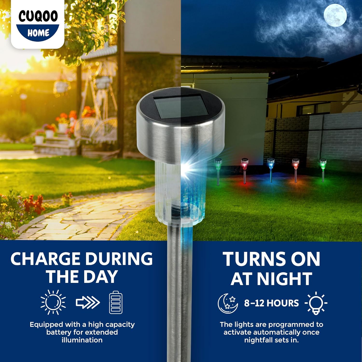 CUQOO Solar Garden Stake Lights – 10pcs Colour Changing LED Lights – Waterproof Rechargeable Stainless Steel Garden Lights for Pathway Lighting – Outdoor Solar Lights for Garden (Multi-Color)