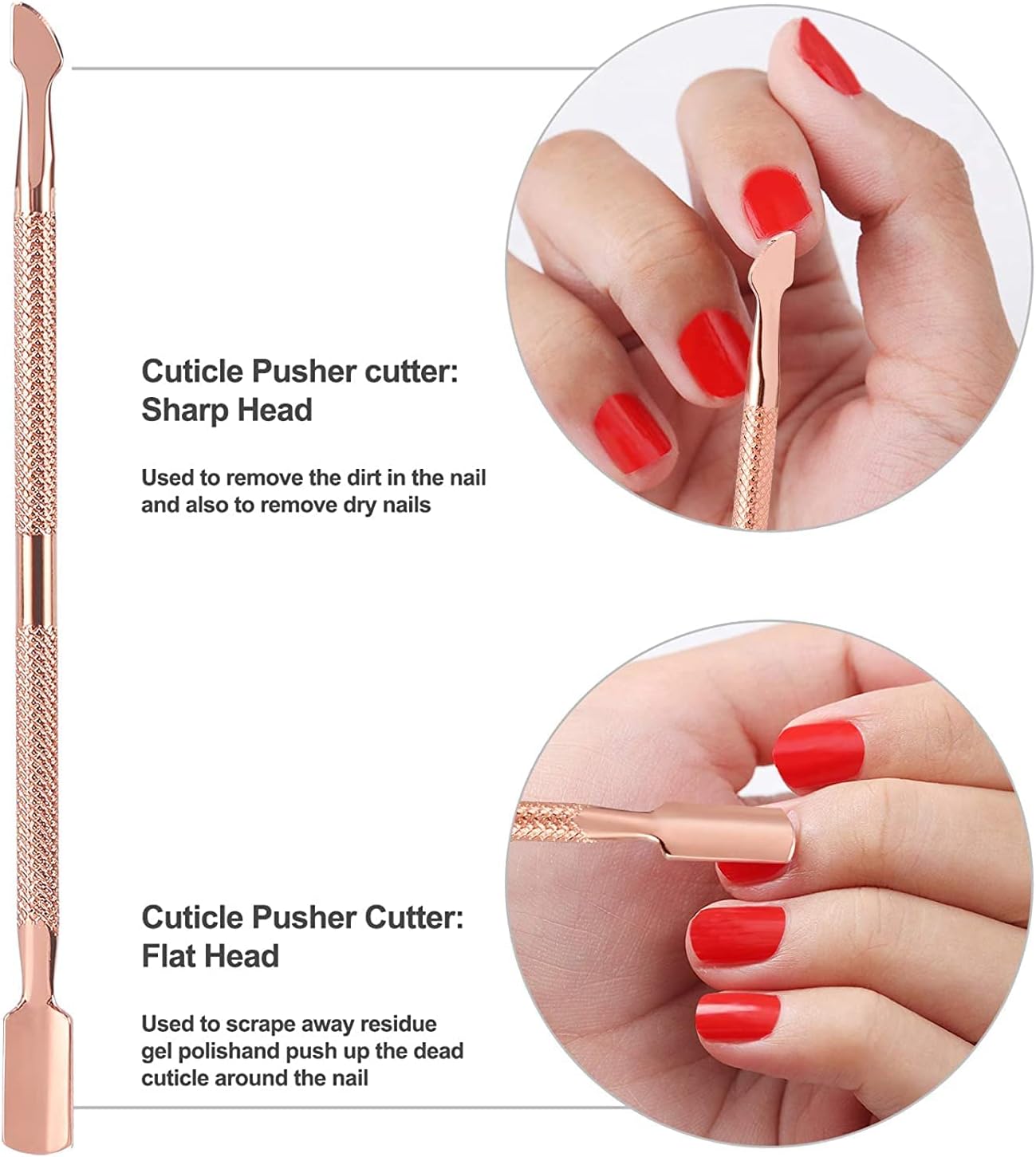 3.【Cuticle Pusher】- sharp to cut or scrape away dead cuticle on one end;Curved spoon shaped perfectly pushes the skin back flawlessly.