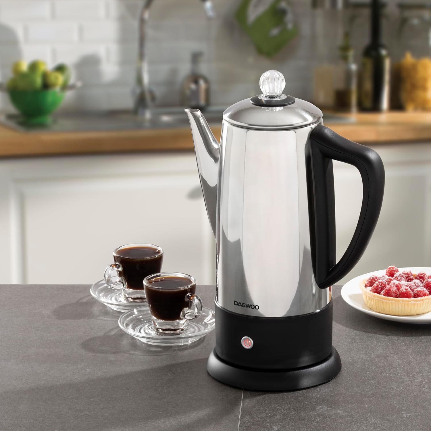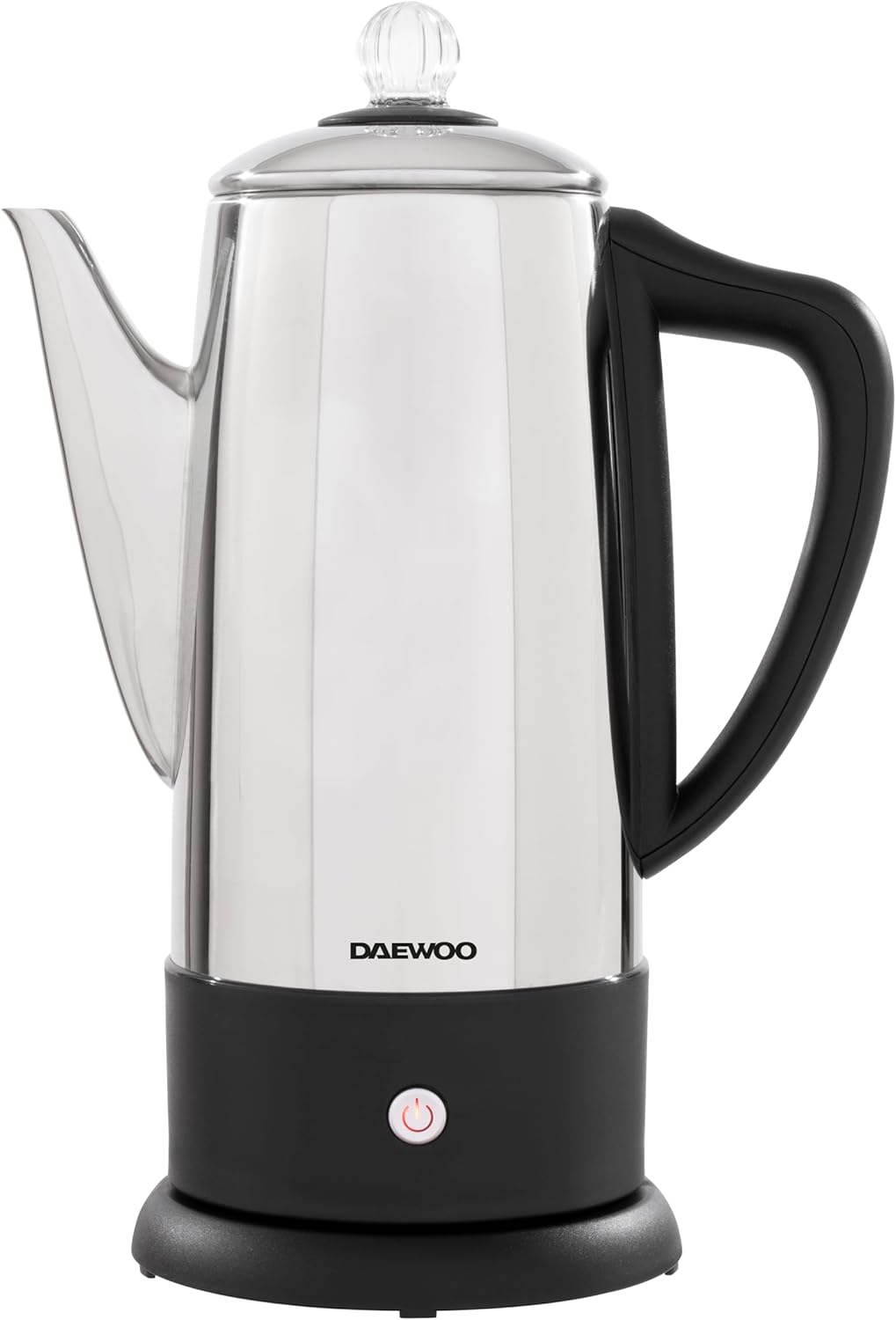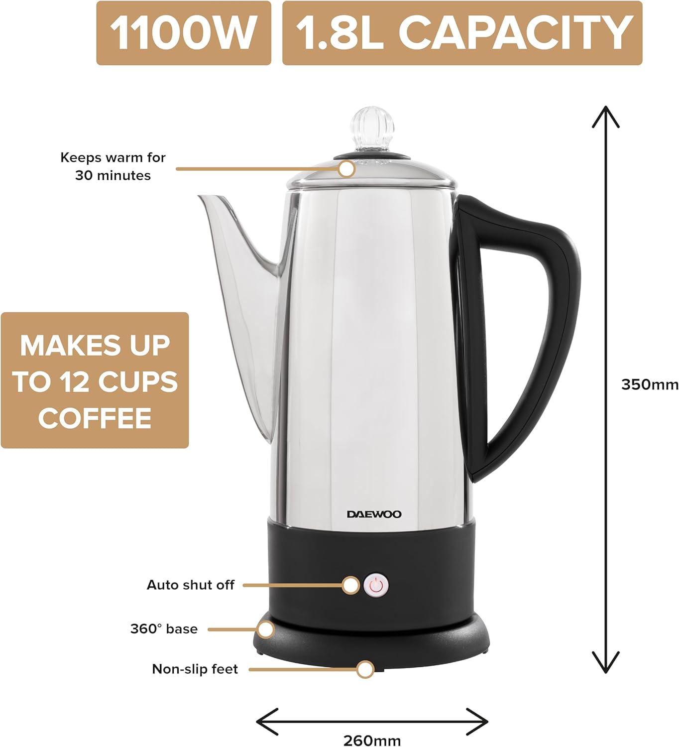 EFFORTLESS BREWING EXPERIENCE – Generously sized at 1.8 Litres, the Daewoo percolator brews up to 12 cups of coffee and stays warm for 30 minutes after brewing, making it perfect for entertaining guests during brunches or gatherings