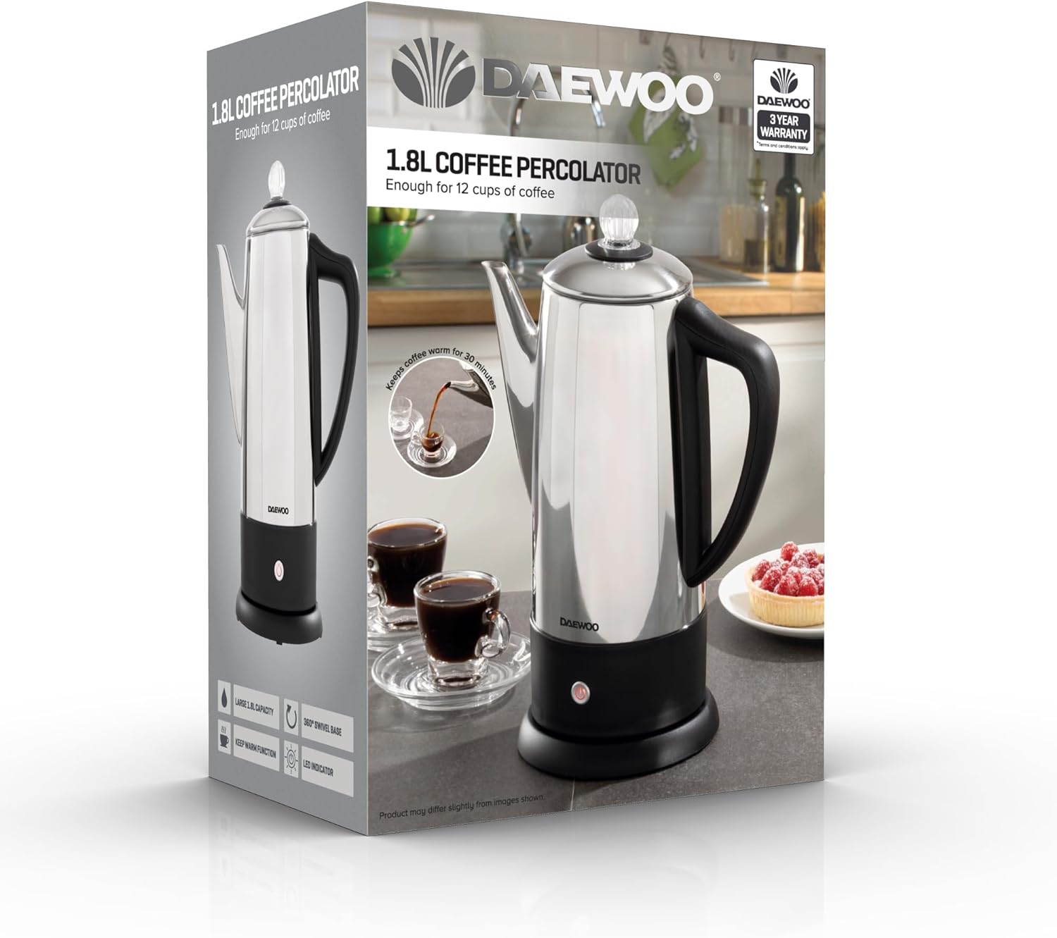 Elevate your mornings and entertain effortlessly with the Daewoo 1.8 Litres Coffee Percolator. Tailored for individuals navigating busy mornings, this percolator brews up to 12 cups of coffee swiftly, ensuring you have a piping hot cup ready to kickstart your day. The intelligent design features clear markings for precise water measurement, an On/Off button with a power indicator light for user-friendly operation, and a removable basket for easy cleaning. The transparent lid and handle allow you to witness the coffee percolation process, adding a touch of visual delight to your morning routine. Whether you’re hosting brunch or enjoying a solo cup, the 360-degree swivel base and non-slip feet provide convenience and stability. For added peace of mind, the Daewoo Coffee Percolator comes with essential safety features, including auto shut-off and boil dry protection. It keeps your coffee warm for 30 minutes post-brewing, ensuring you can savour every sip. To maintain optimal performance, the descaling process is simplified—fill to the 12-cup mark, add descaling product, boil, and let it soak for 15-20 minutes. Plus, enjoy the assurance of a 3-year warranty, subject to online registration, making your coffee experience worry-free and delightful.
