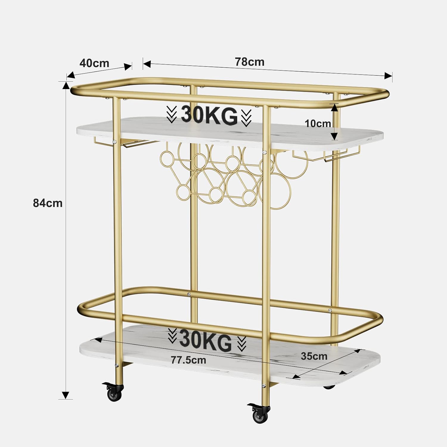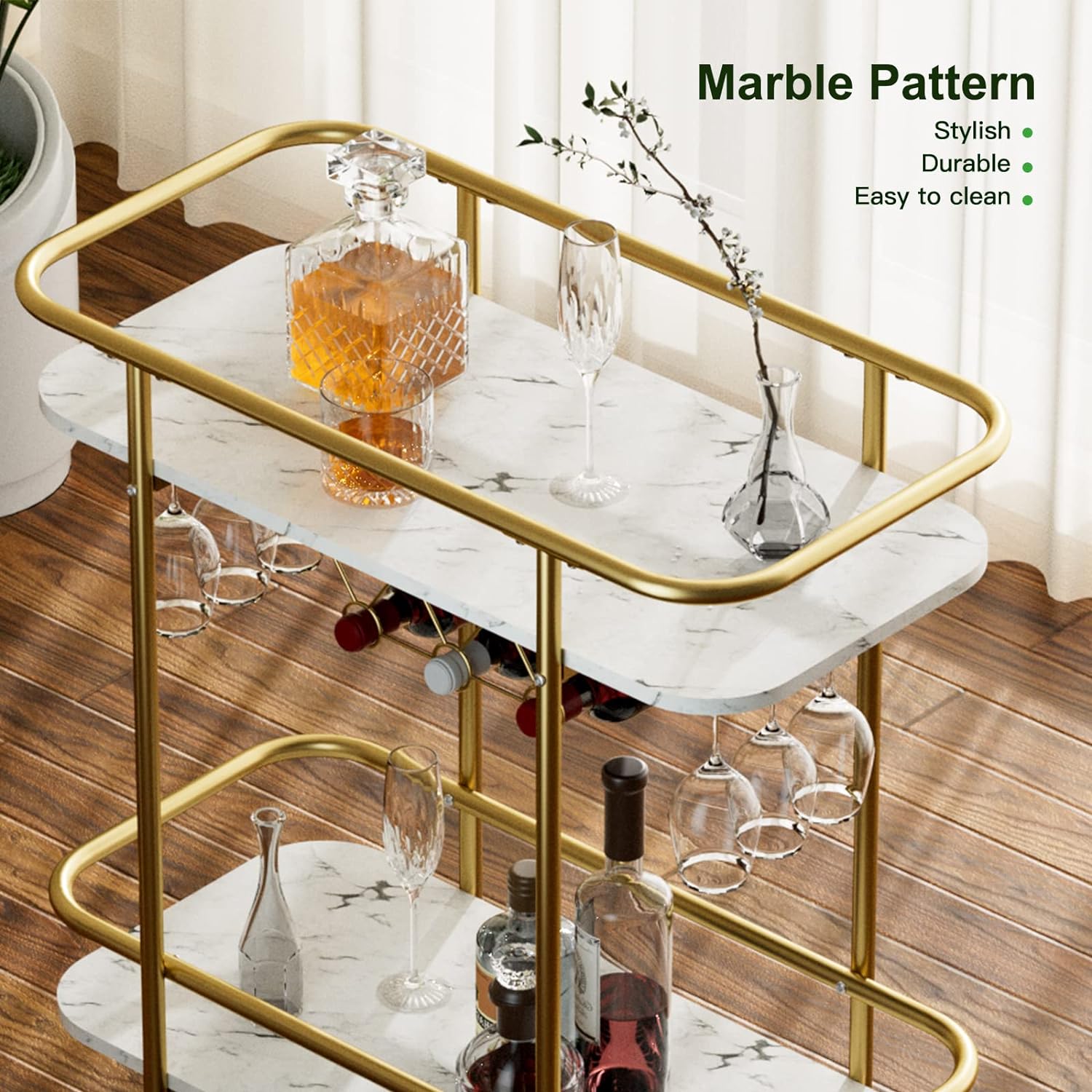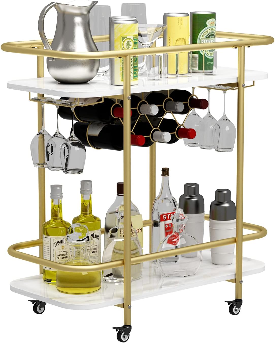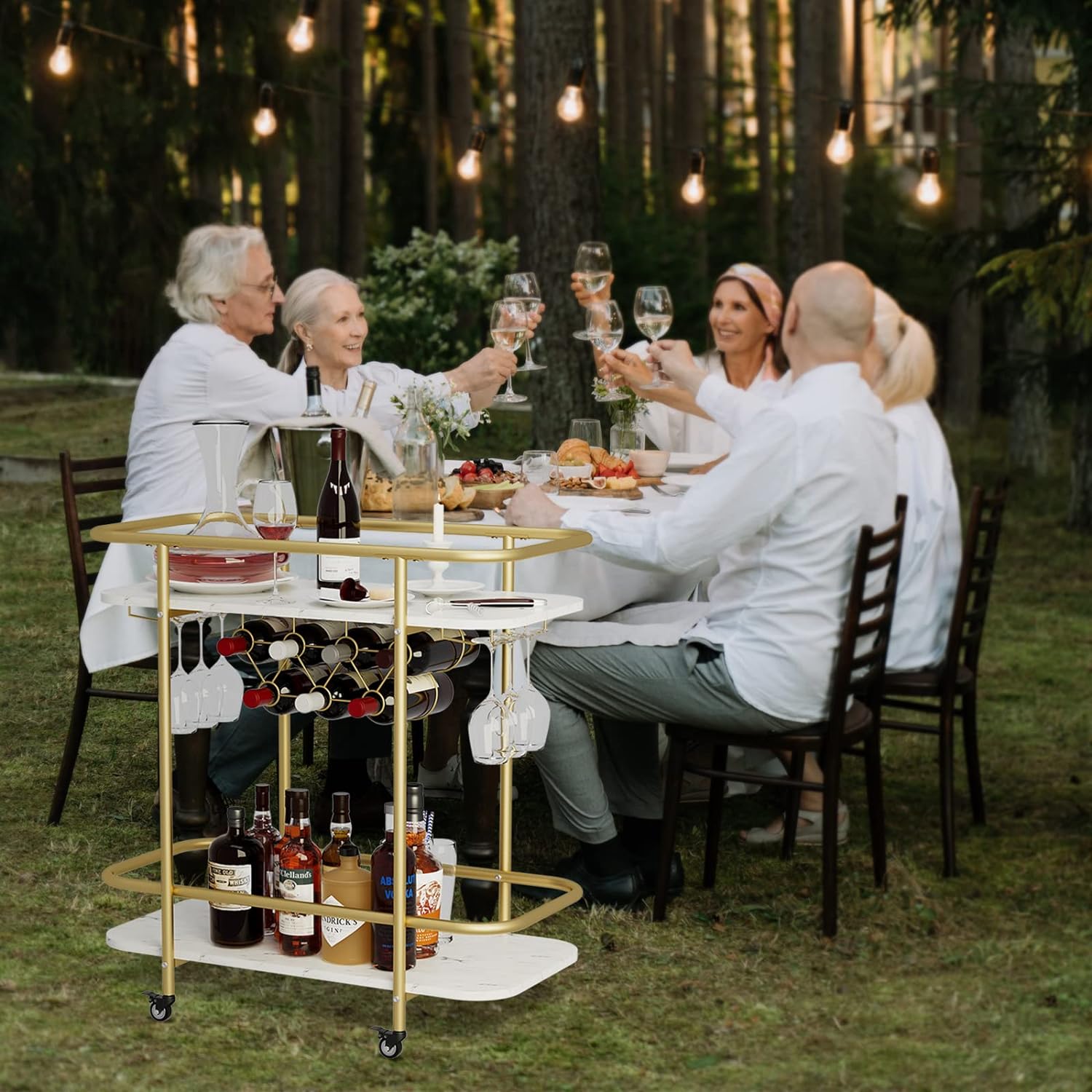 DAWNYIELD 2 Tier Mobile Drinks Trolley Bar Serving Cart on Wheels with Wine Rack and Glass Holder Modern Rolling Drinks Storage Trolley for Home Kitchen Party (Gold)