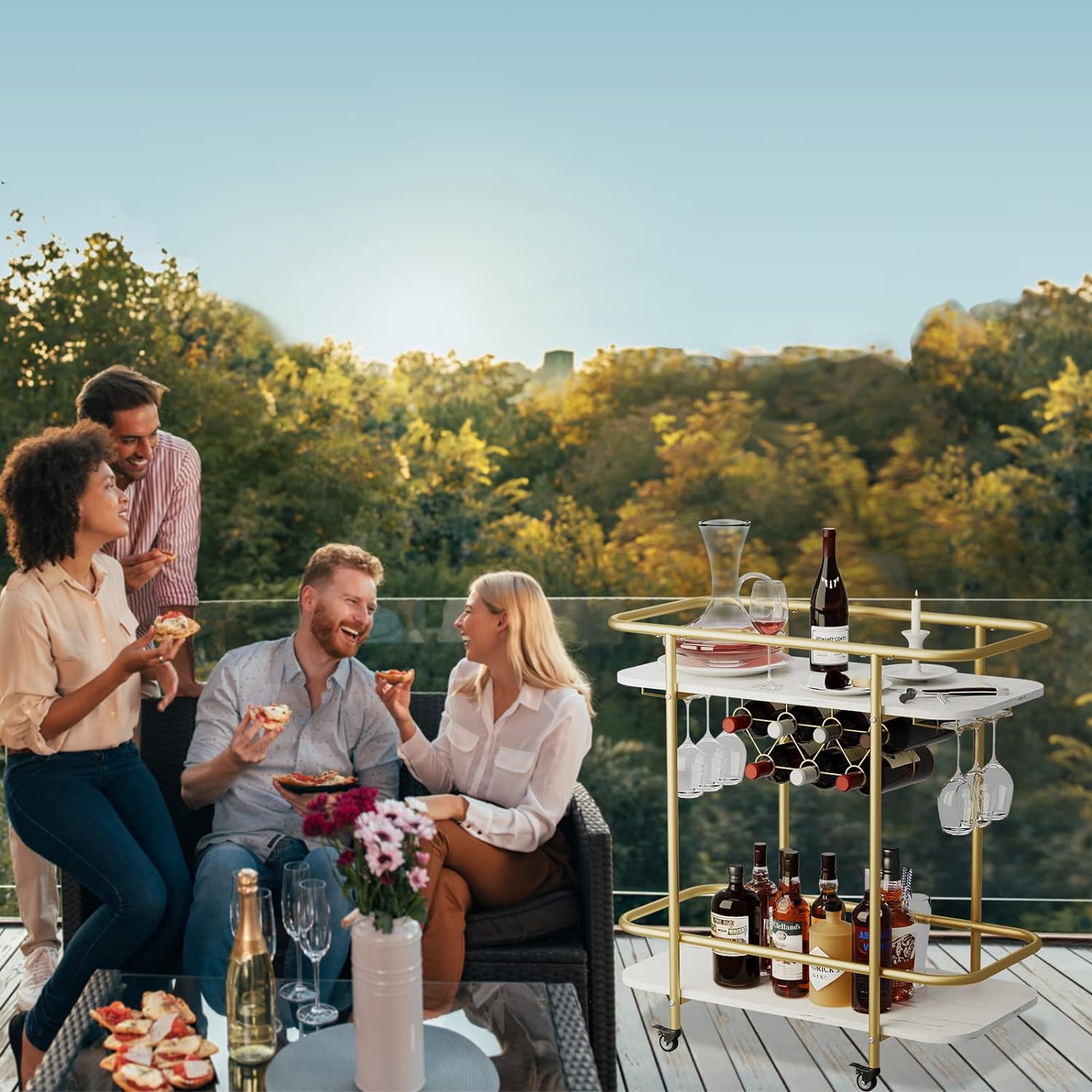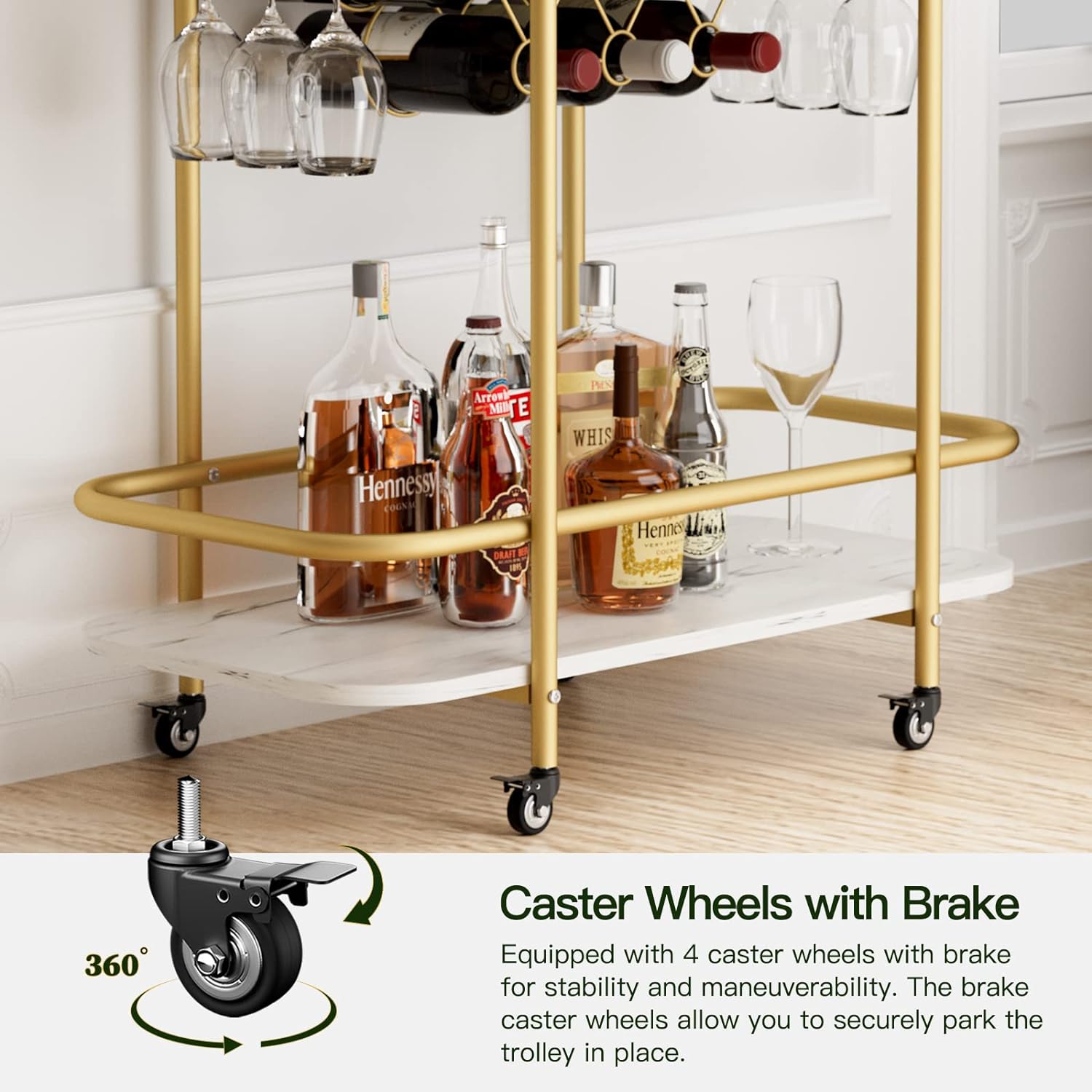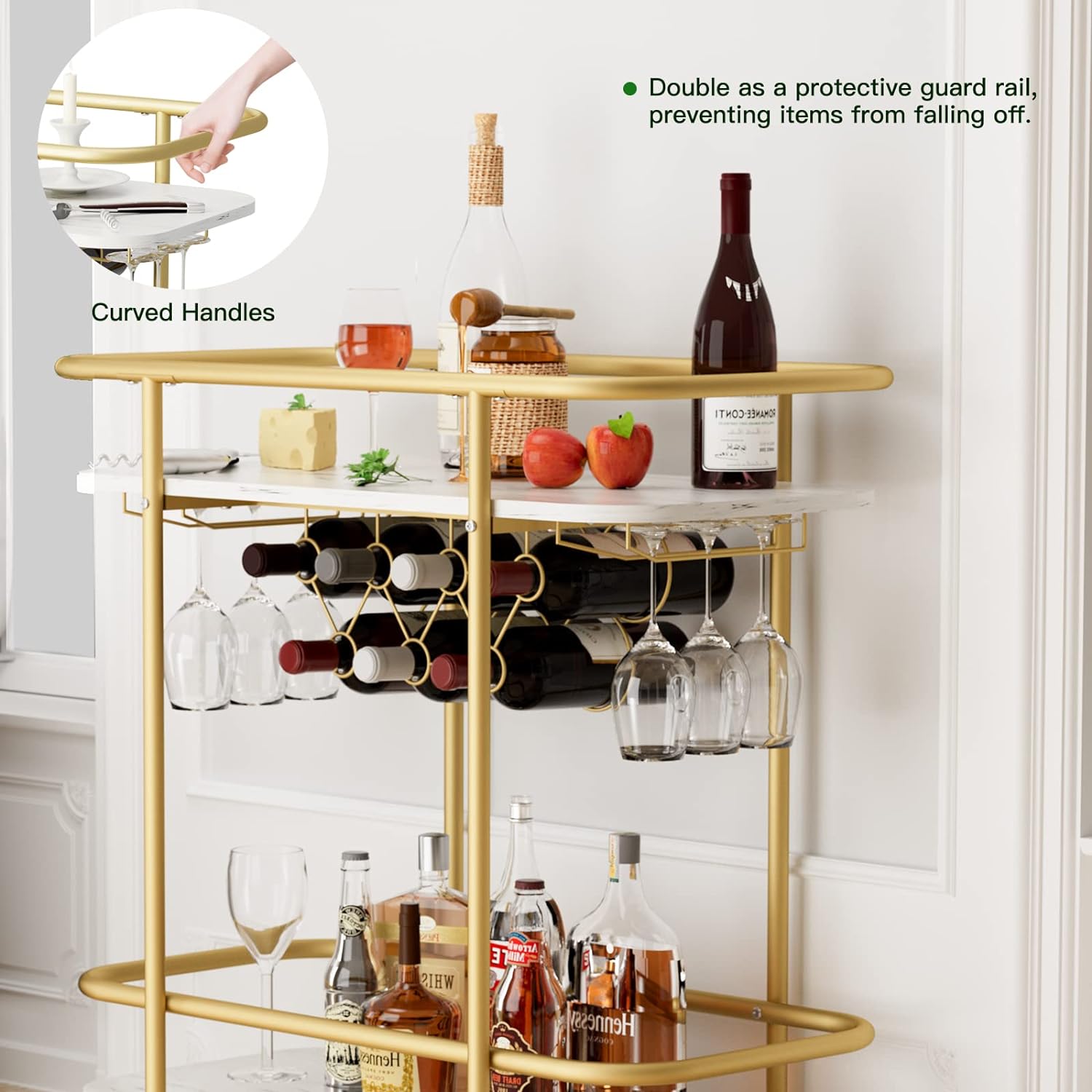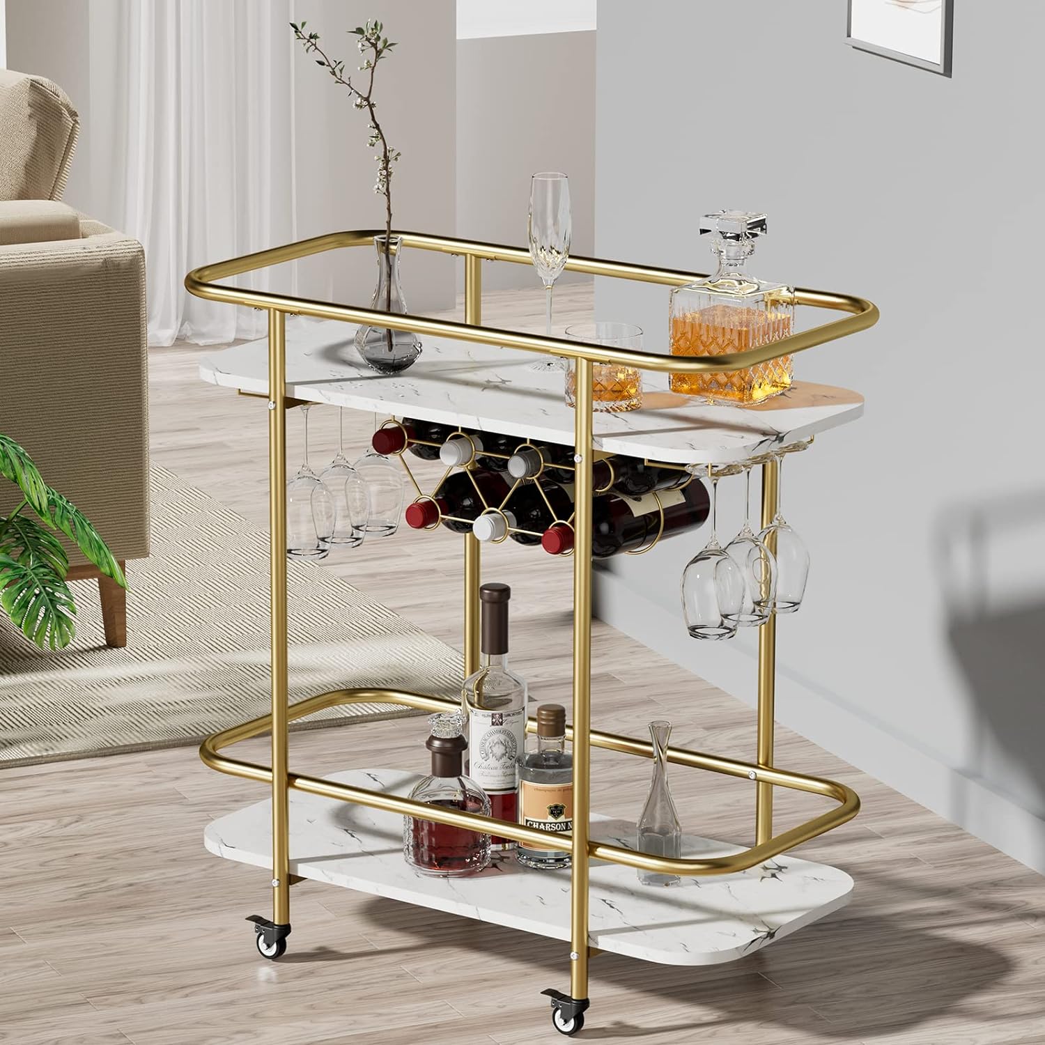 DAWNYIELD 2 Tier Mobile Drinks Trolley Bar Serving Cart on Wheels with Wine Rack and Glass Holder Modern Rolling Drinks Storage Trolley for Home Kitchen Party (Gold)